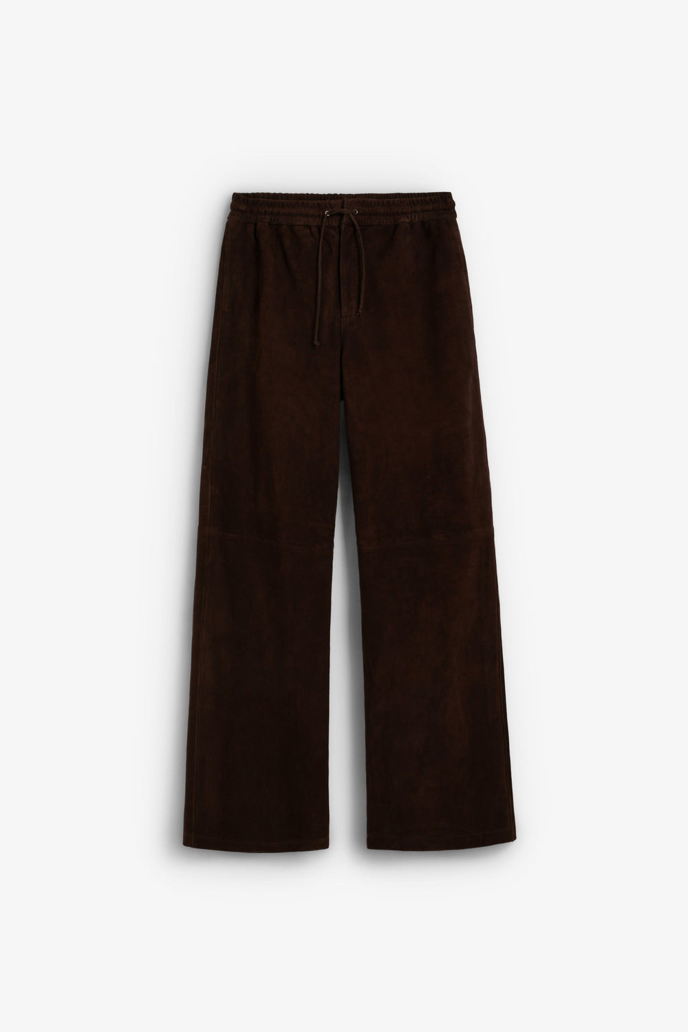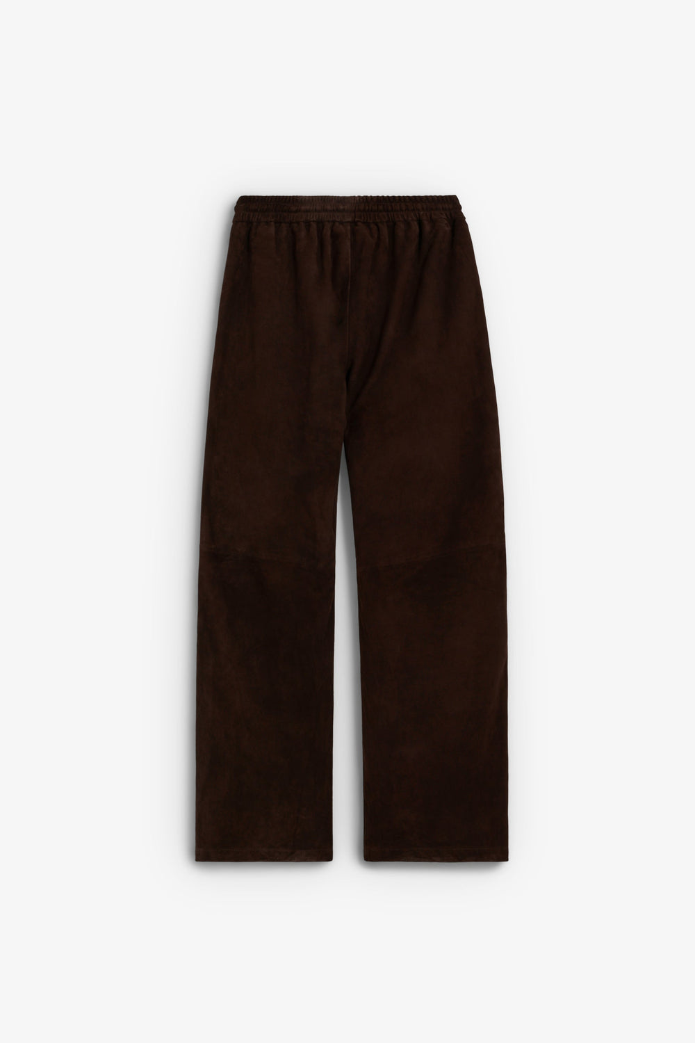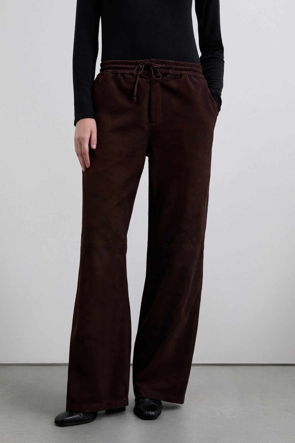 Trousers made of 100% suede. Elasticated waist with tie fastening. Side pockets. Straight cut and high waist.