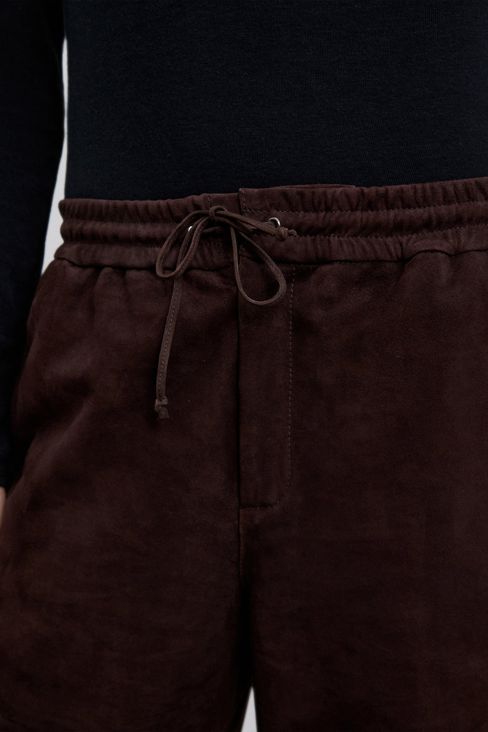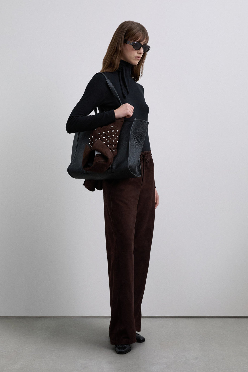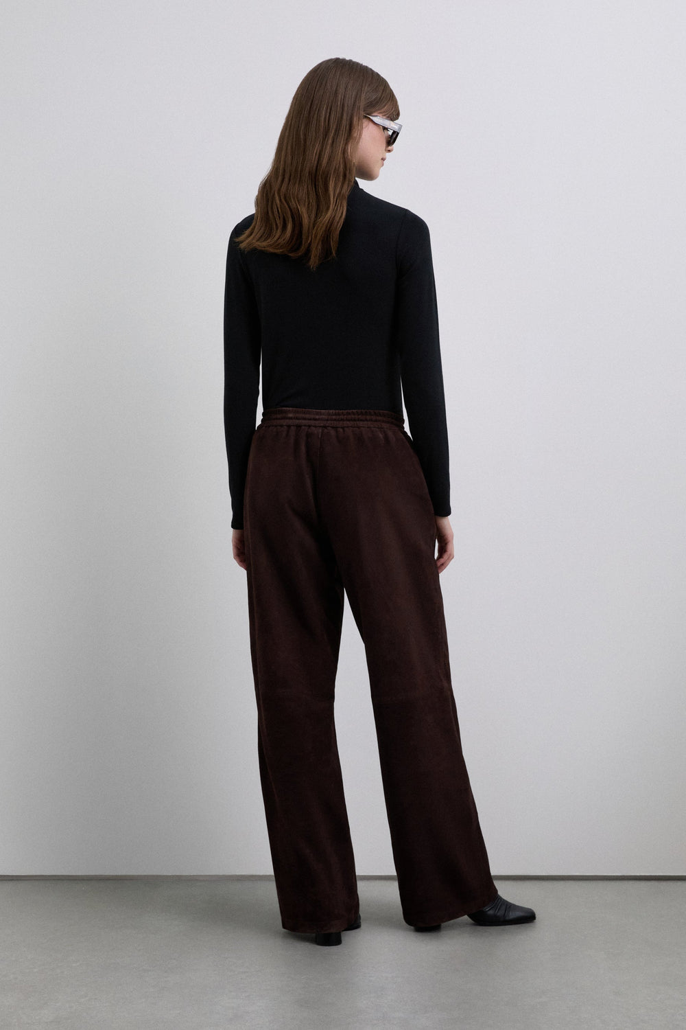 Trousers made of 100% suede. Elasticated waist with tie fastening. Side pockets. Straight cut and high waist.