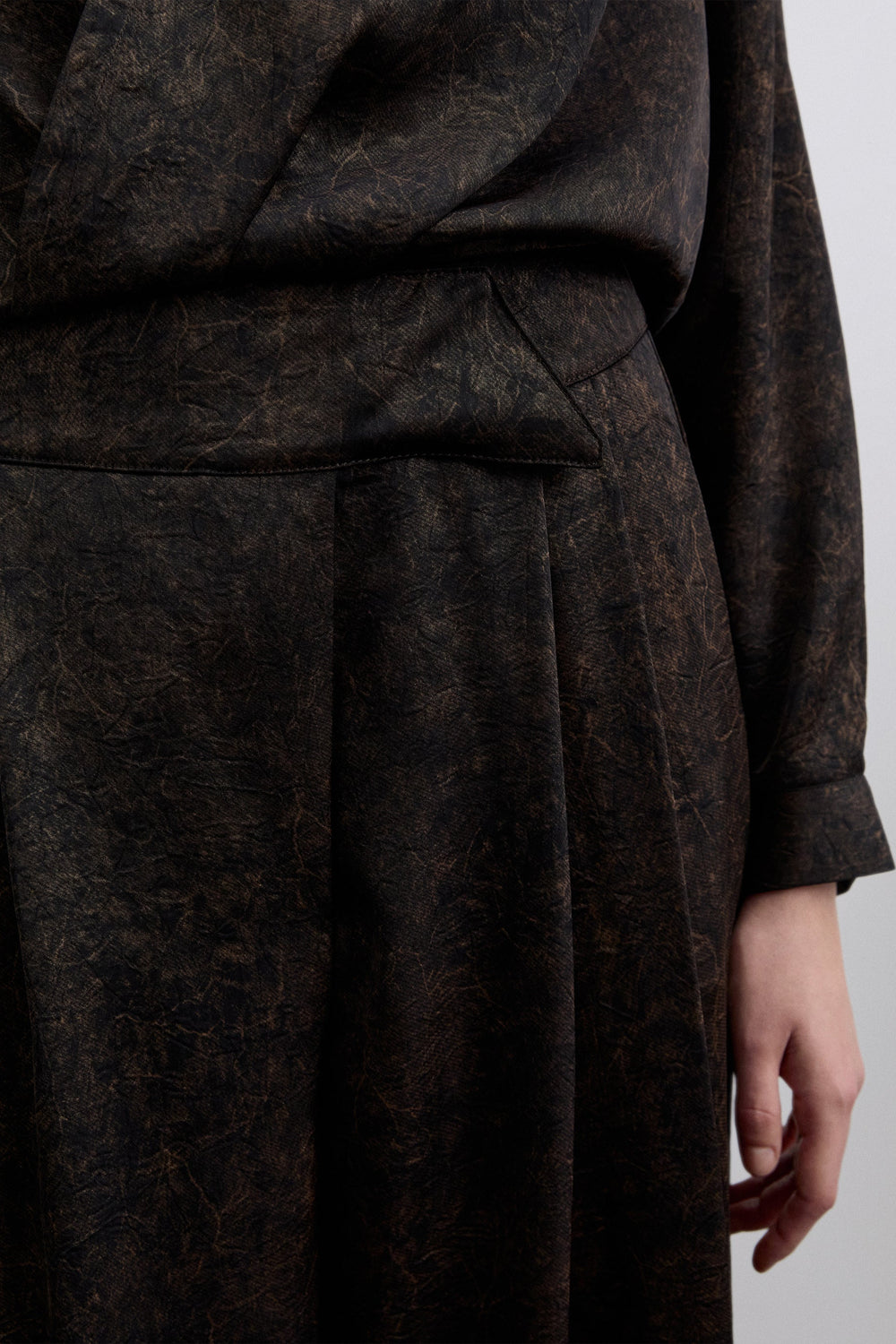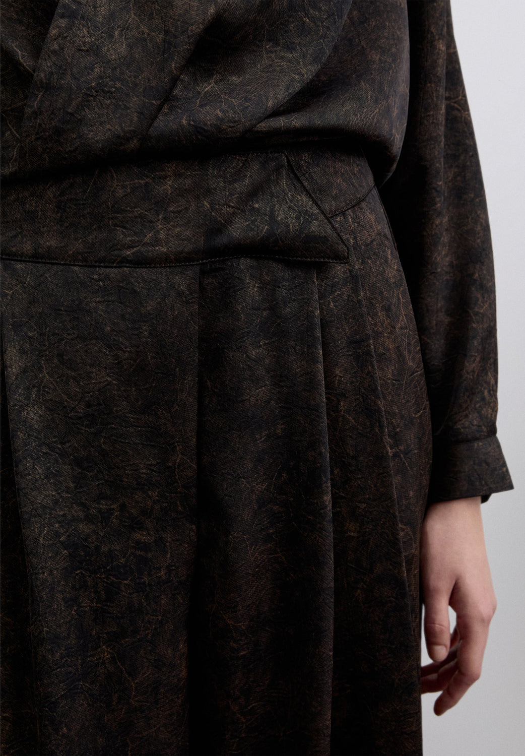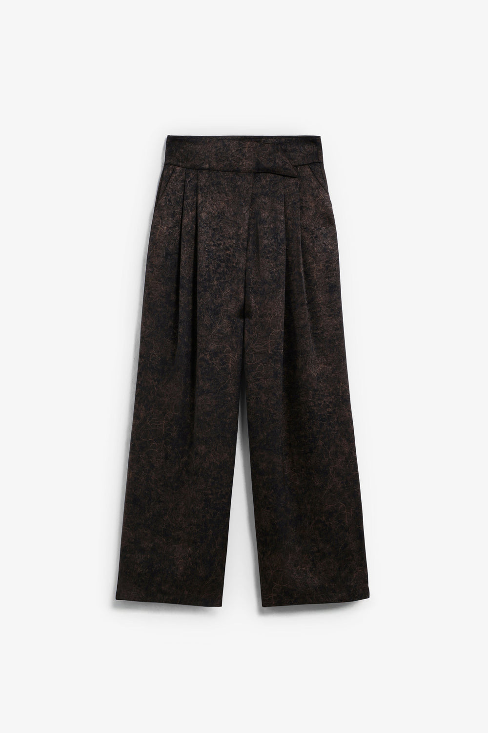 Trousers made of a flowing fabric with satin finish. Marbleised effect print. Culotte style. Front zip fastening and side pockets.
