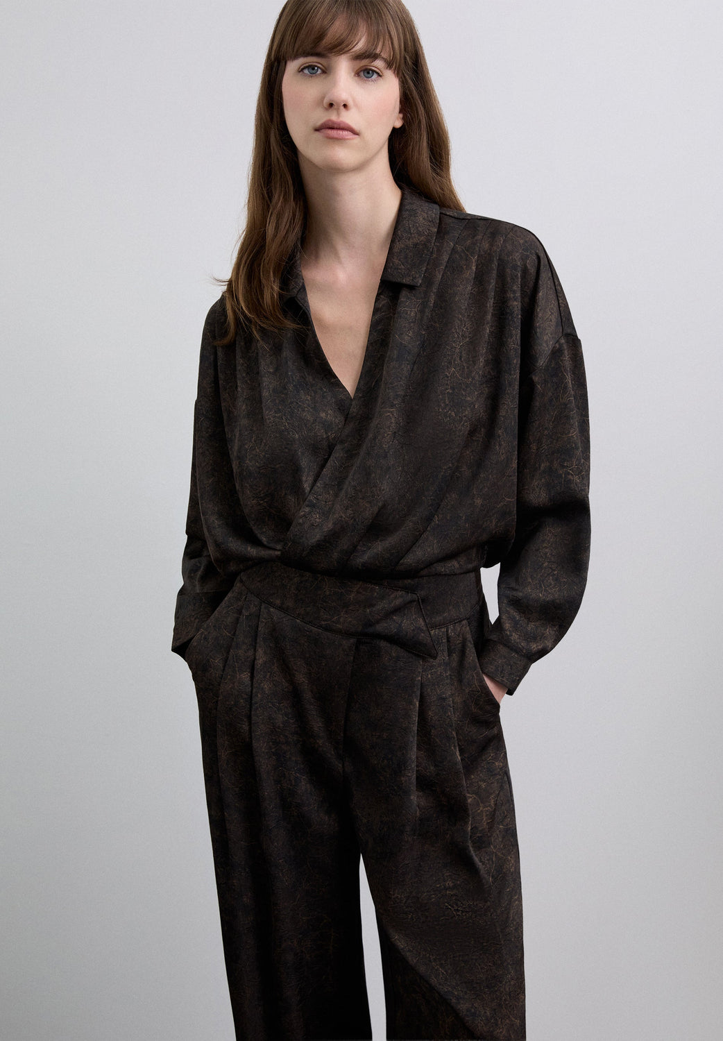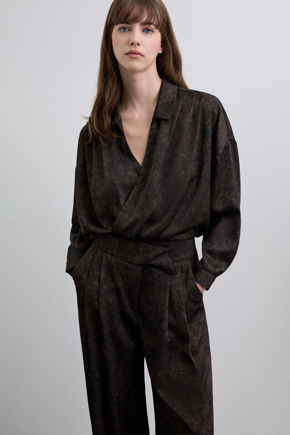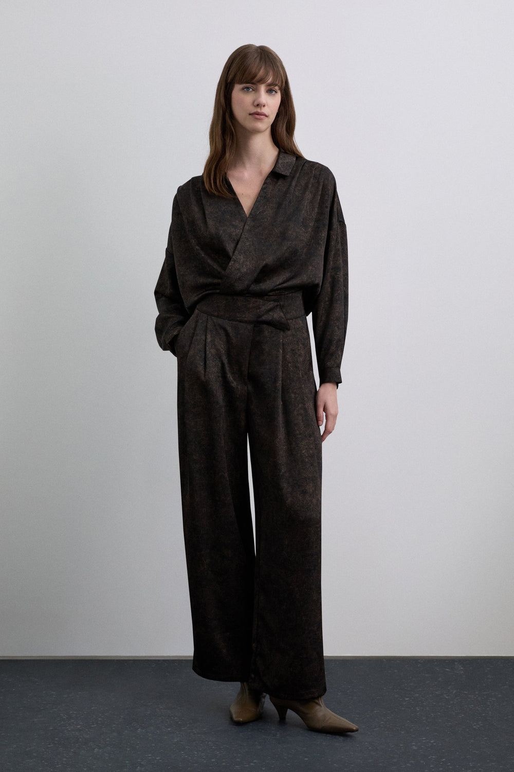 Trousers made of a flowing fabric with satin finish. Marbleised effect print. Culotte style. Front zip fastening and side pockets.