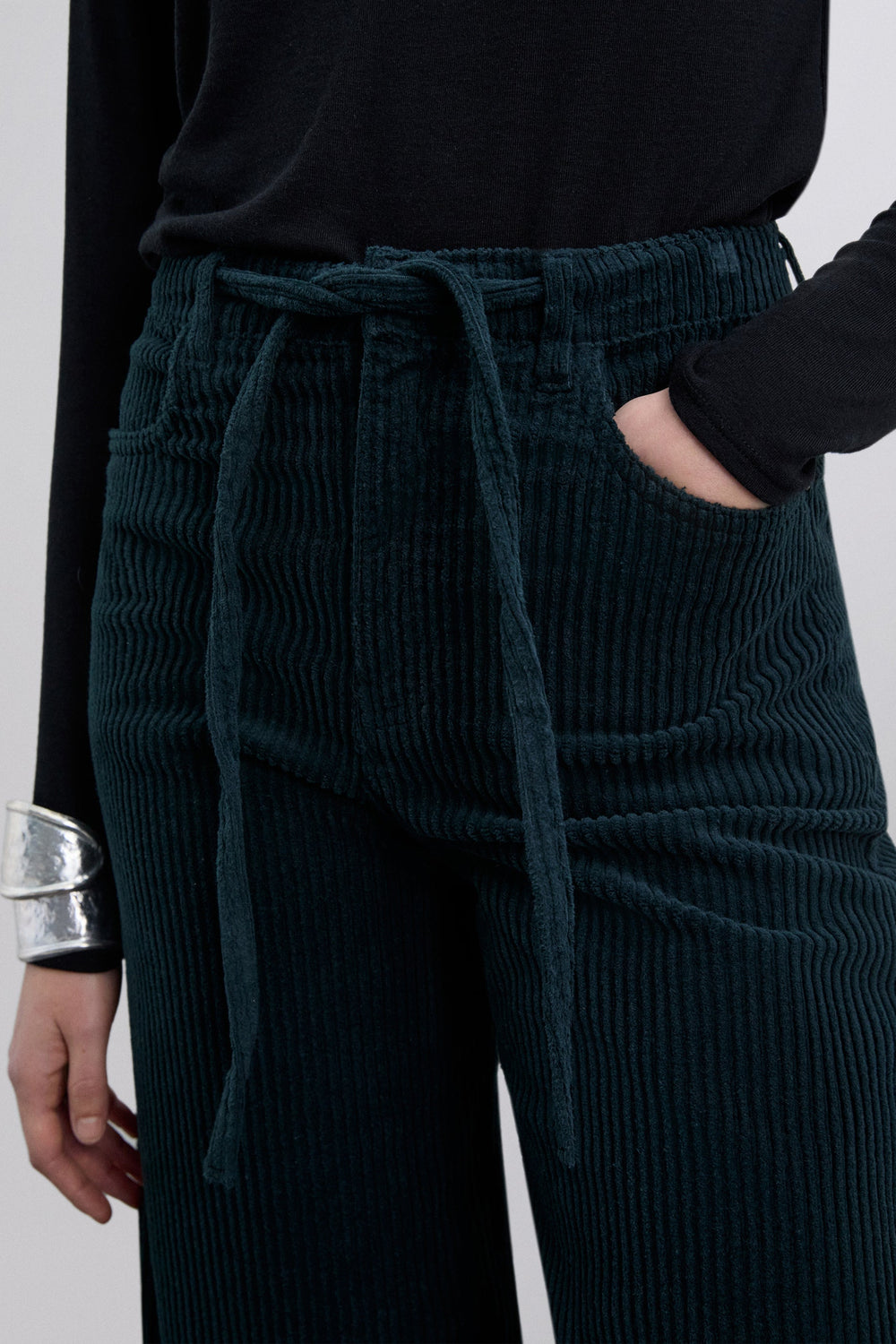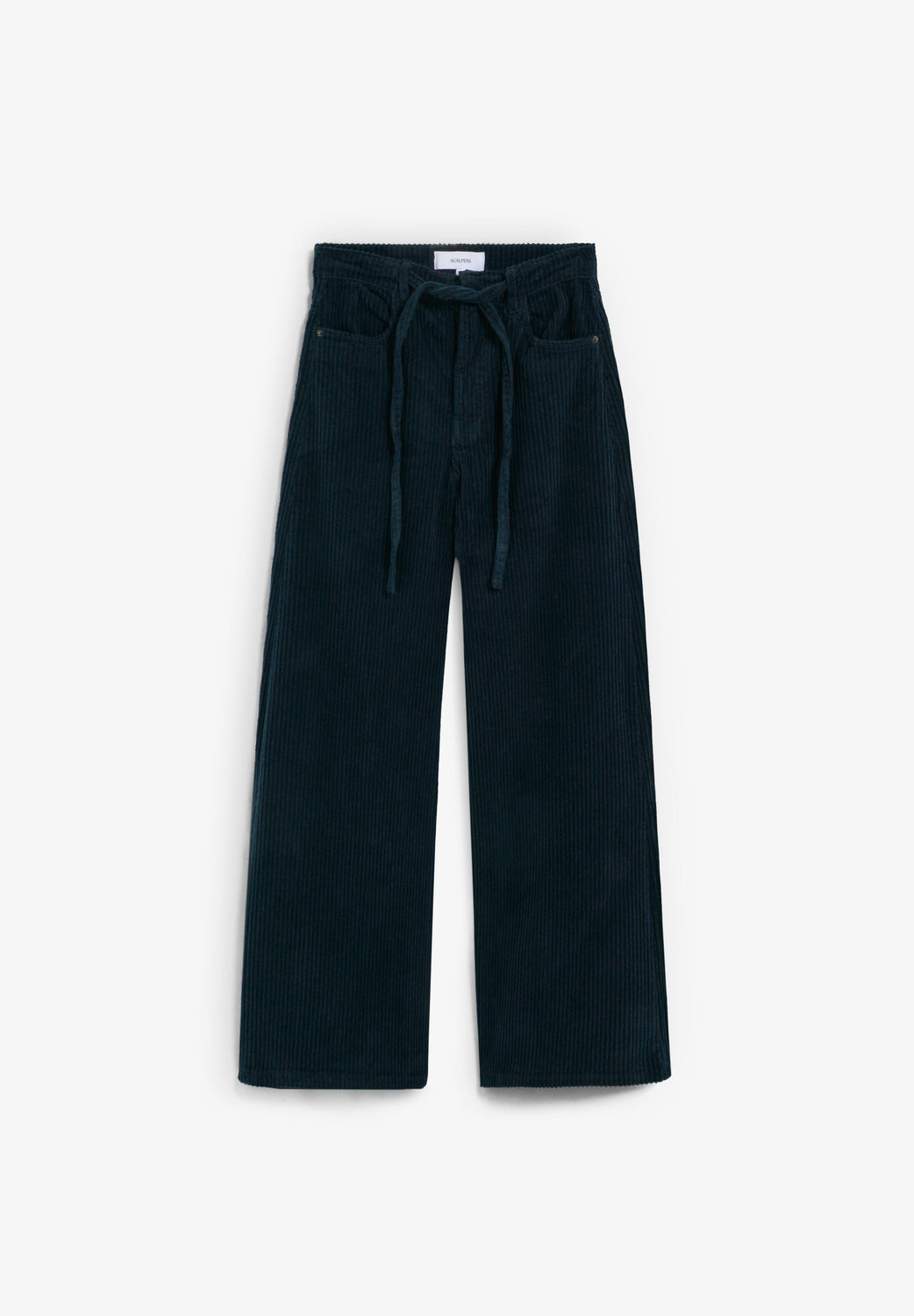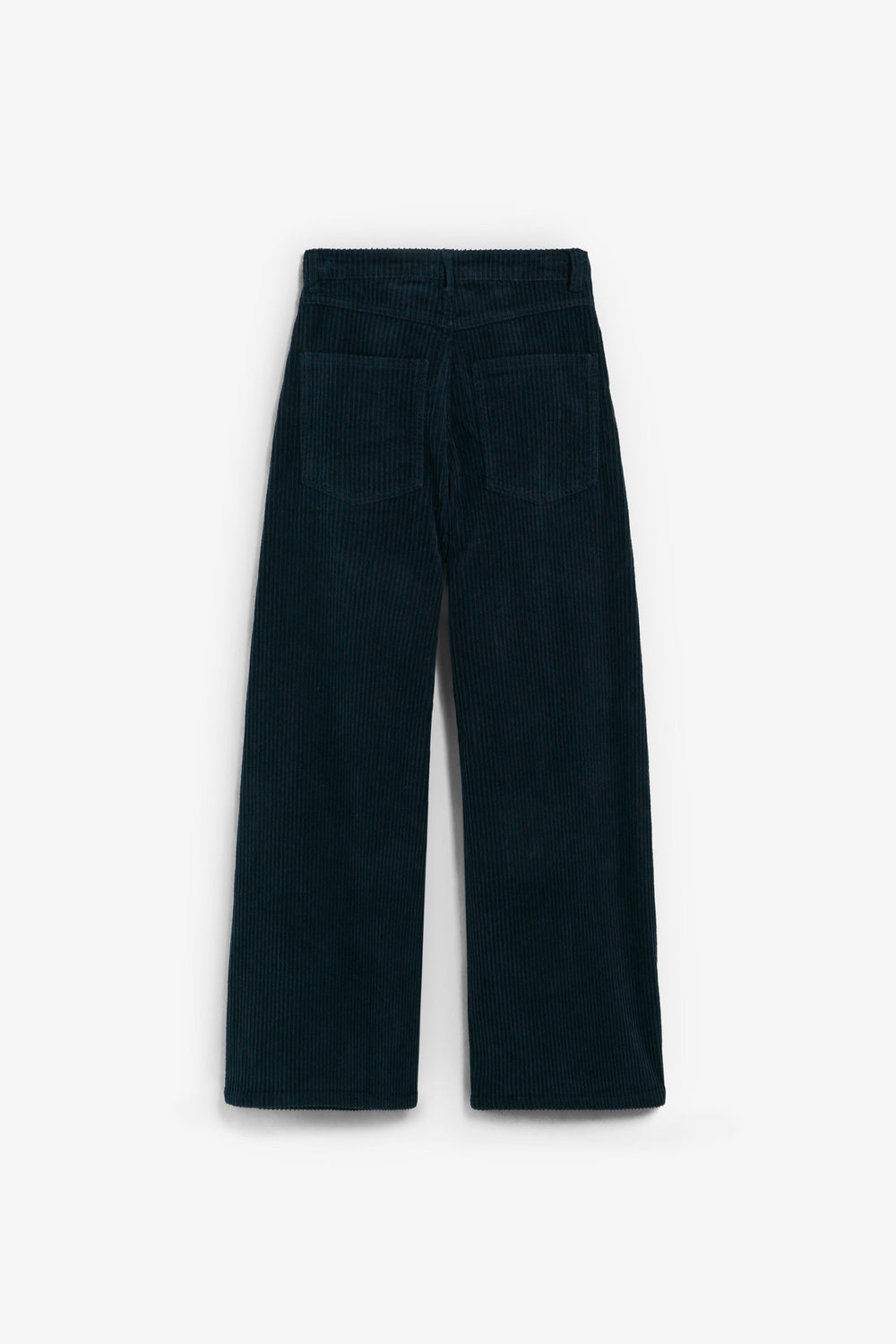 Trousers made of BCI cotton. Full length. Corduroy effect. Matching drawstring waist. Side and back pockets.
