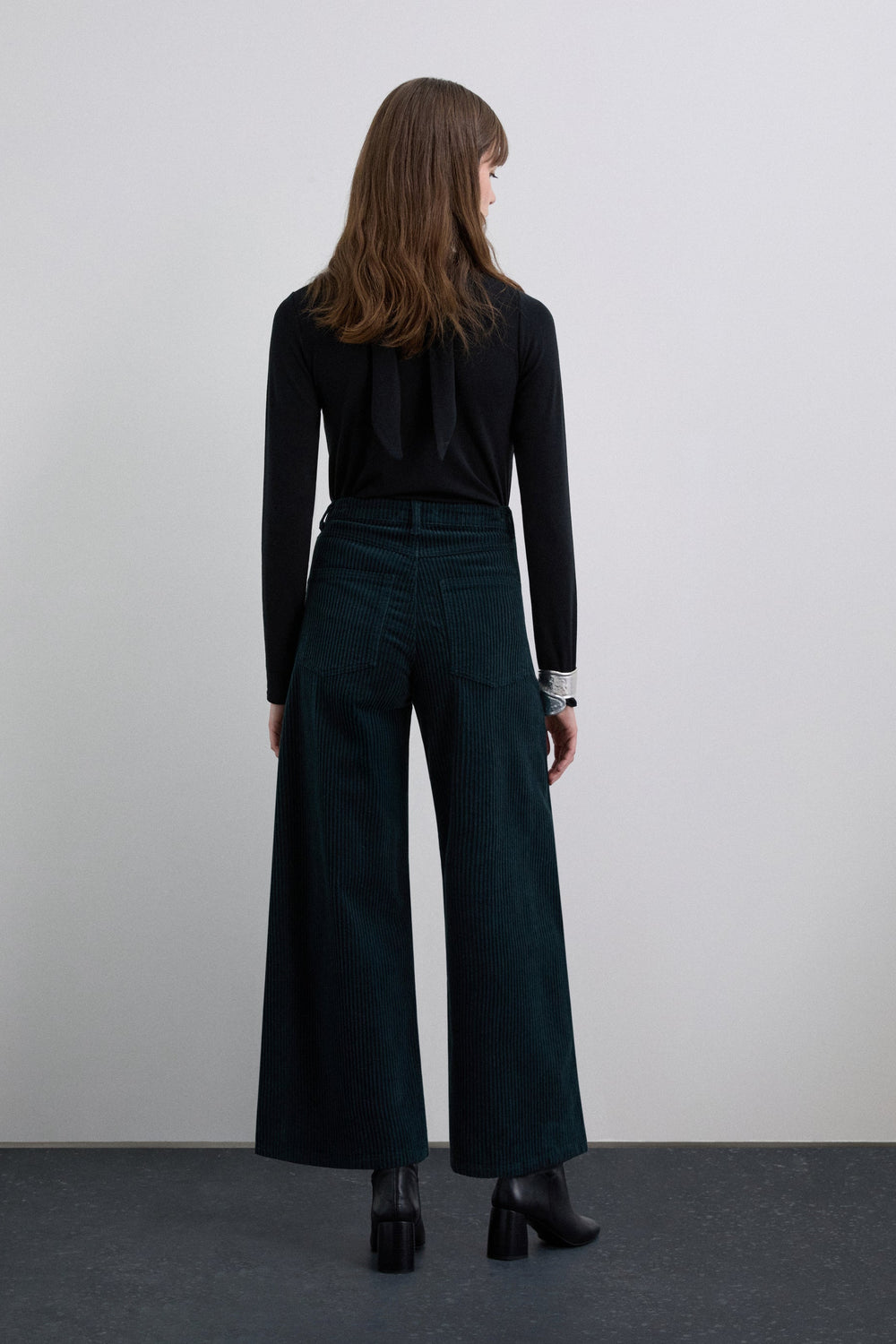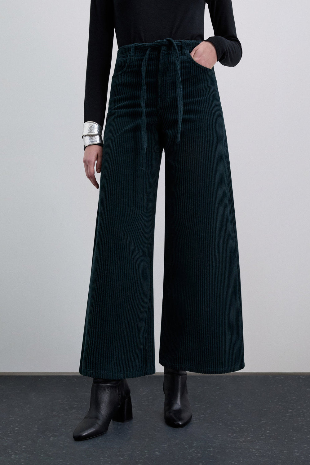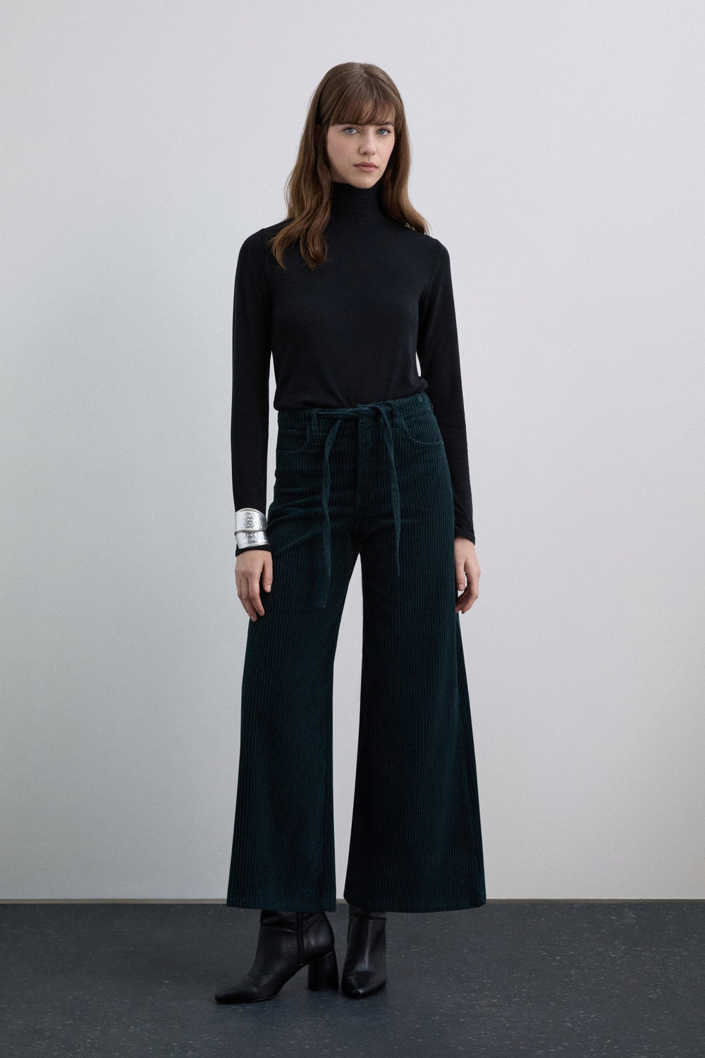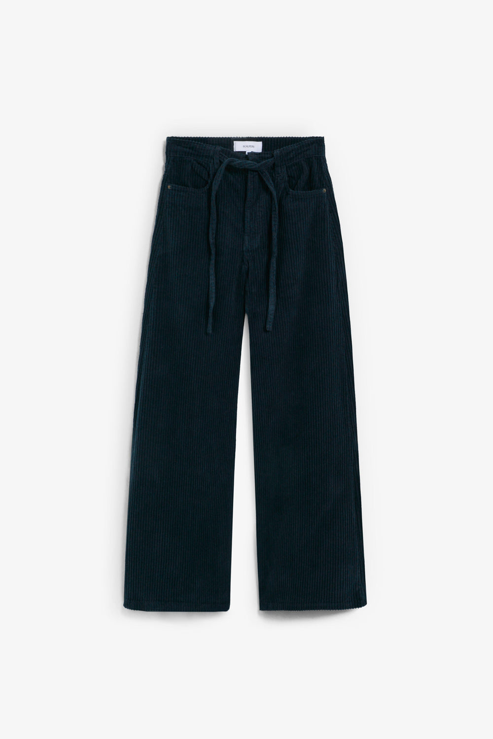 Trousers made of BCI cotton. Full length. Corduroy effect. Matching drawstring waist. Side and back pockets.