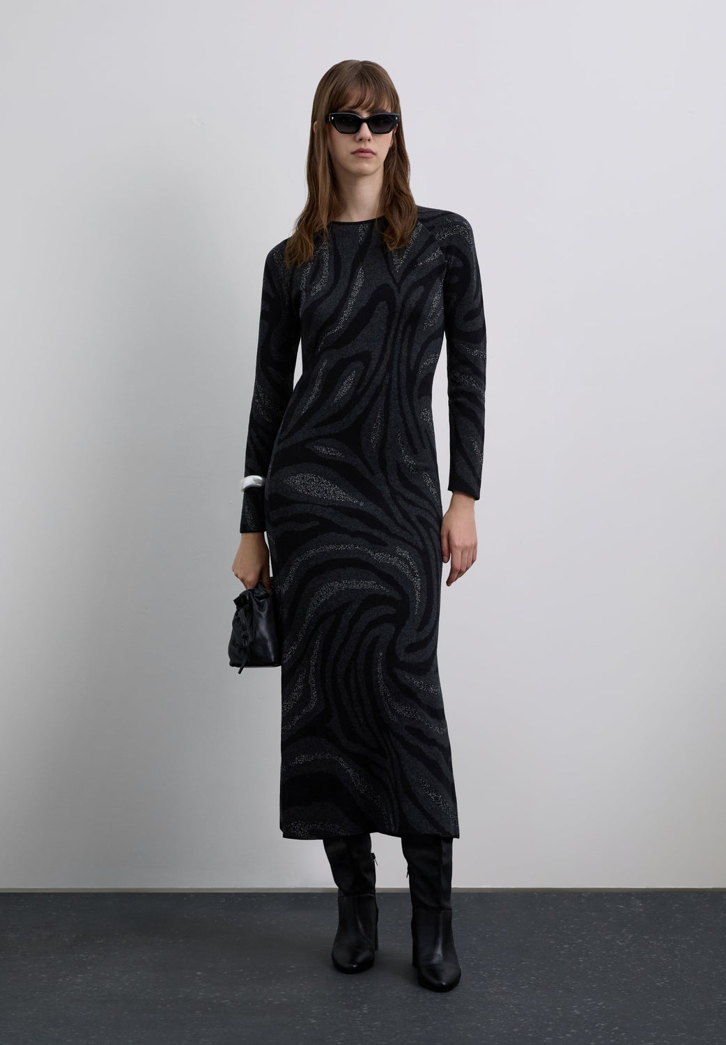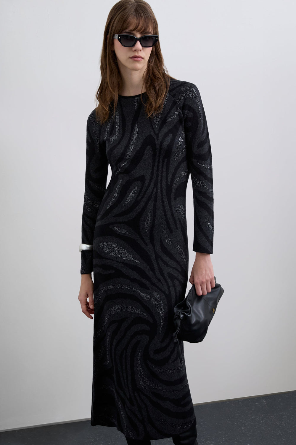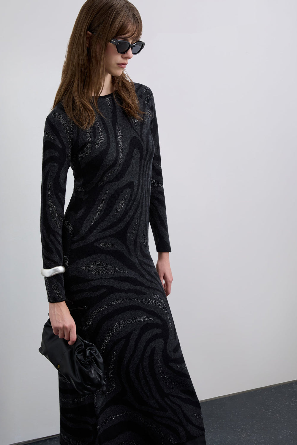 Long printed knit dress. Long sleeves. Round neck. Matching metallic appliqué detail on the back.