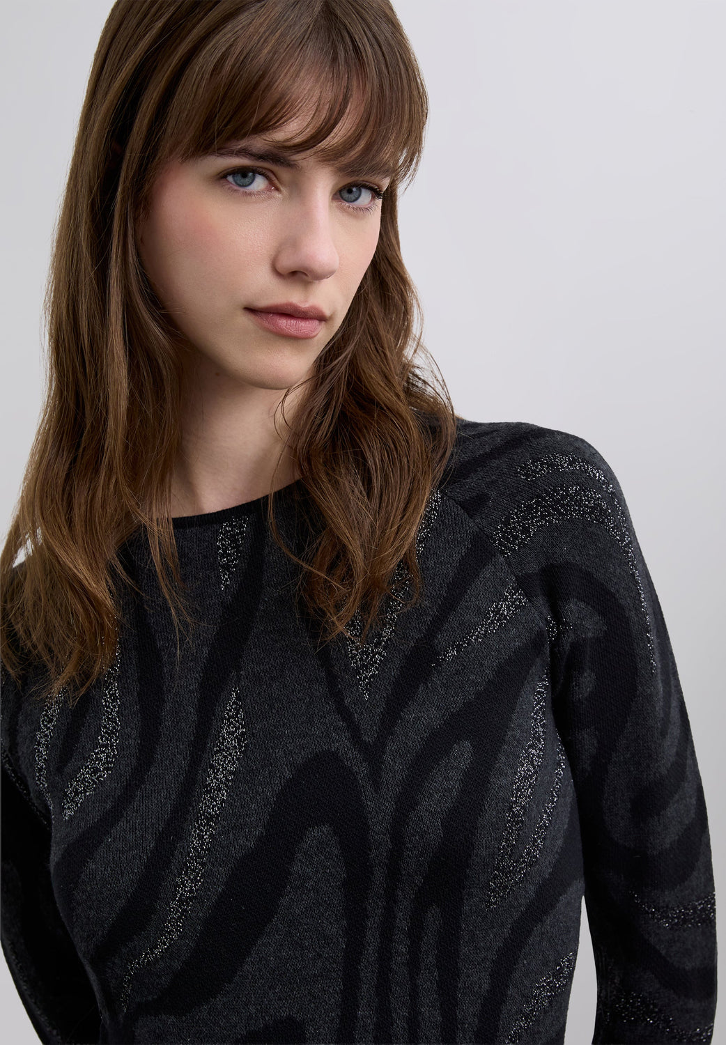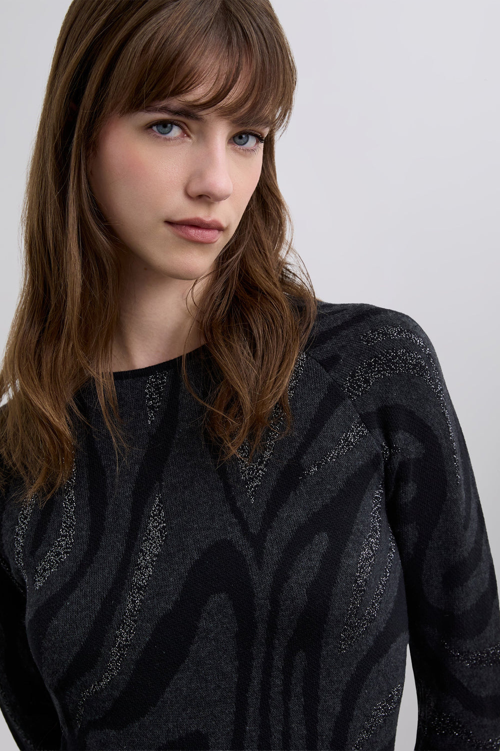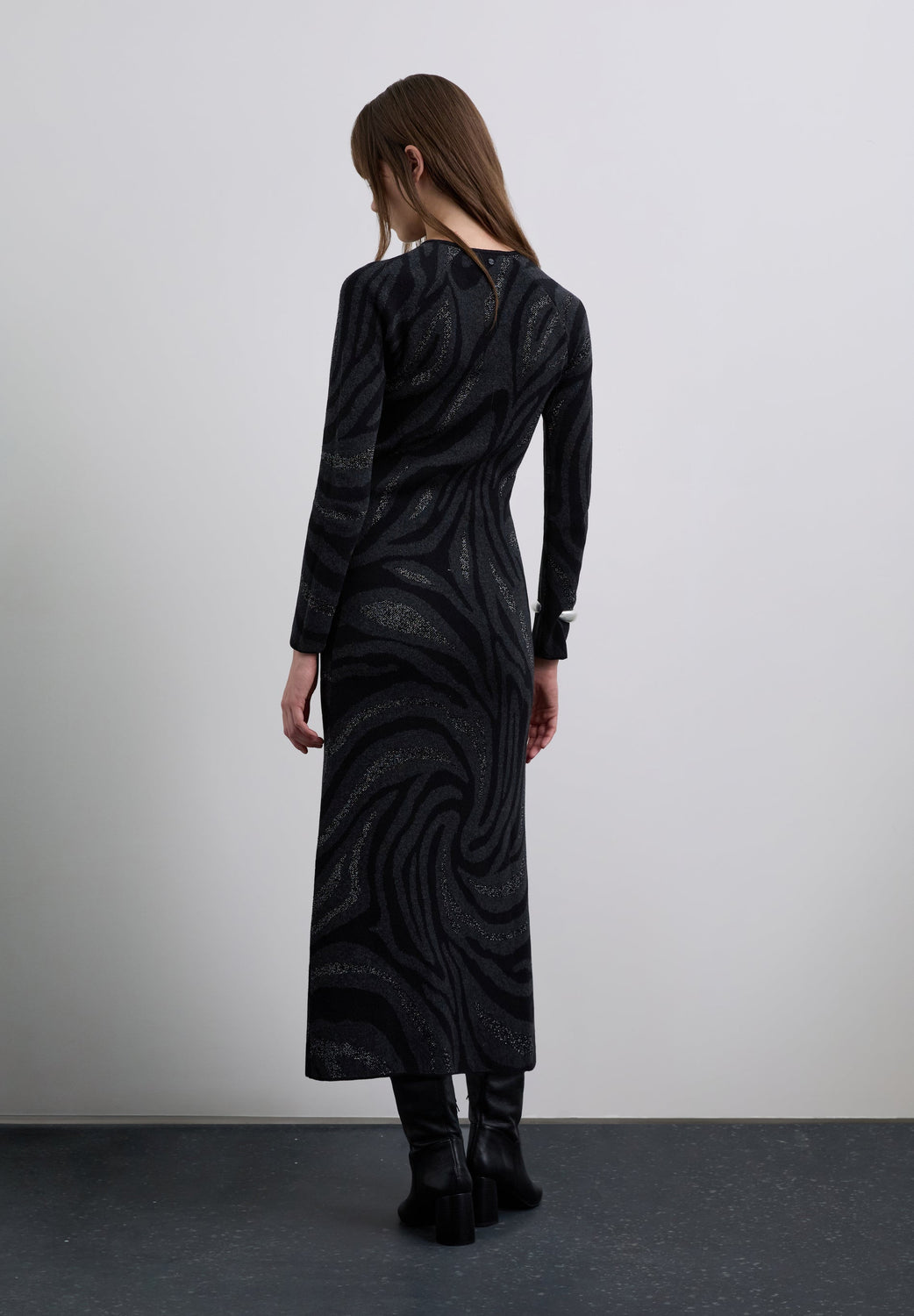 Long printed knit dress. Long sleeves. Round neck. Matching metallic appliqué detail on the back.