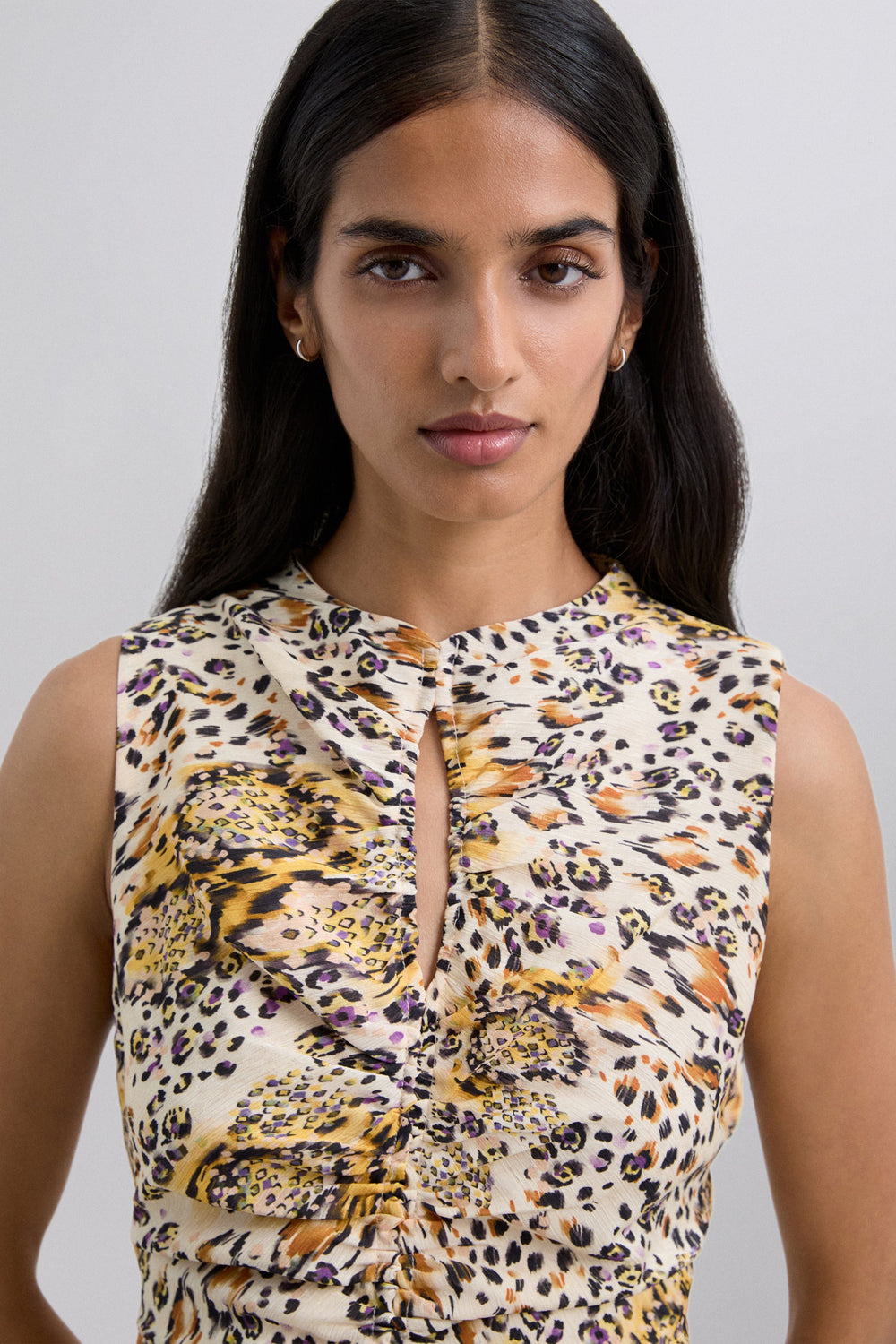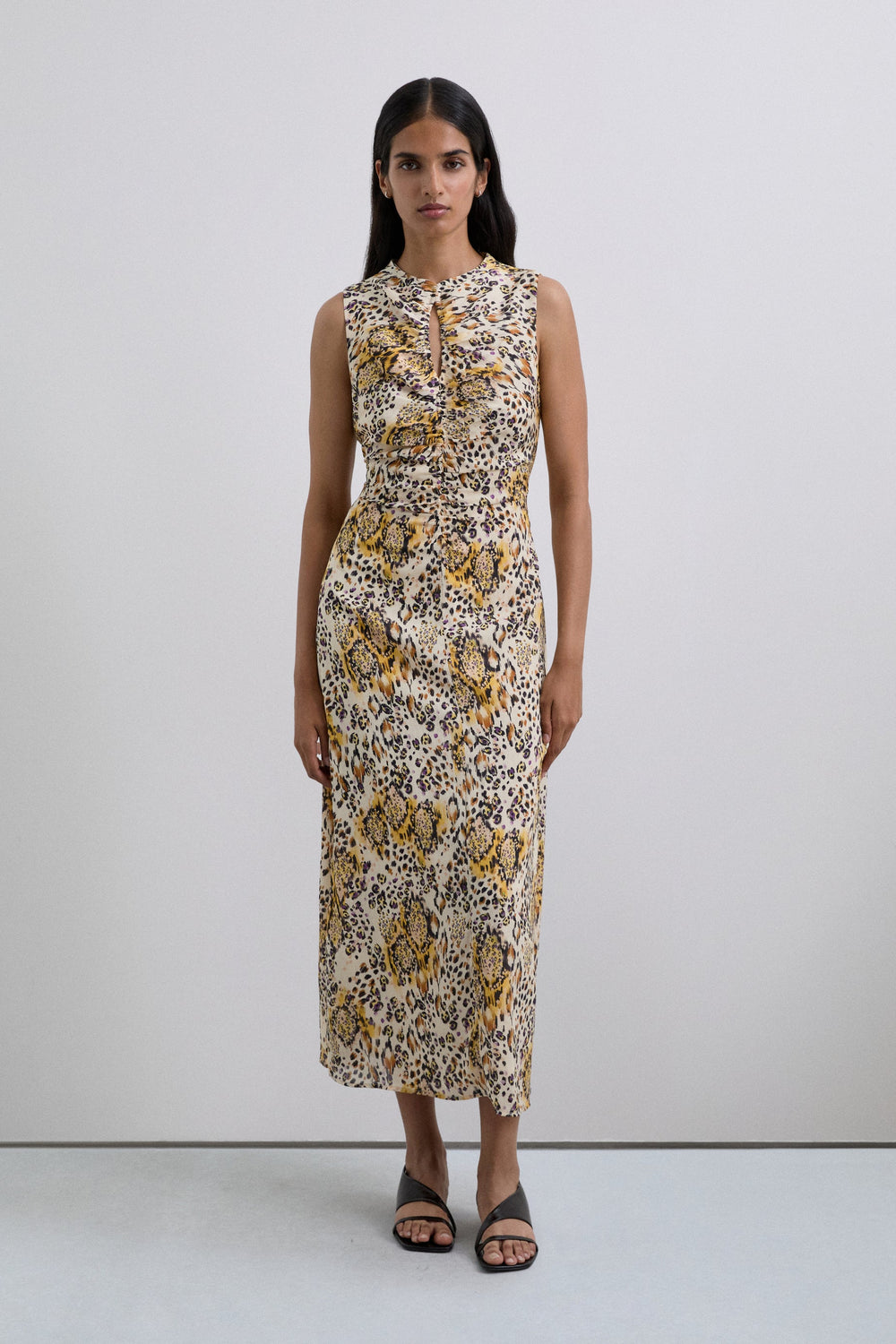 Long flowing animal print dress. Regular fit. Cutaway and gathered at the front with front slit. Sleeveless design.