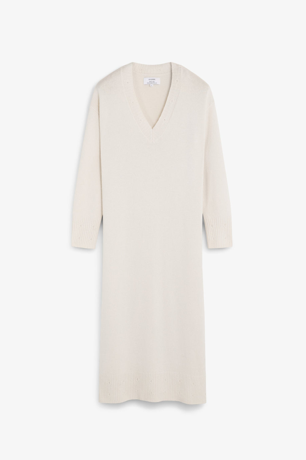 Loose fit midi-length dress with V-neckline and long sleeves. Special stitching details on the neckline, cuffs and hem. Mini holes around the bottom.