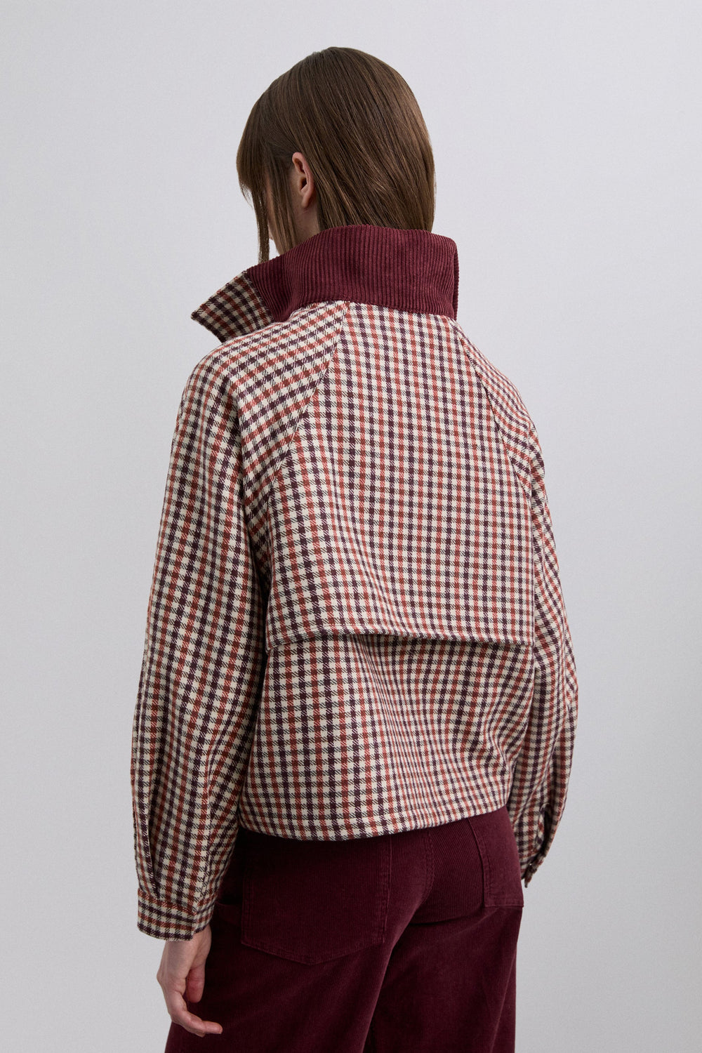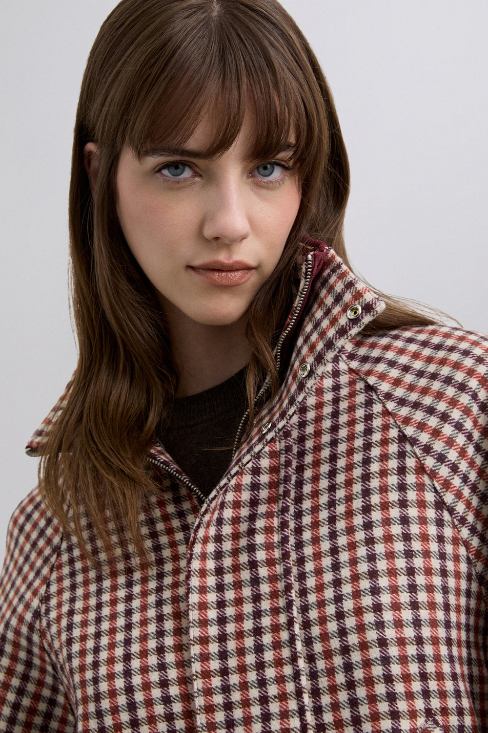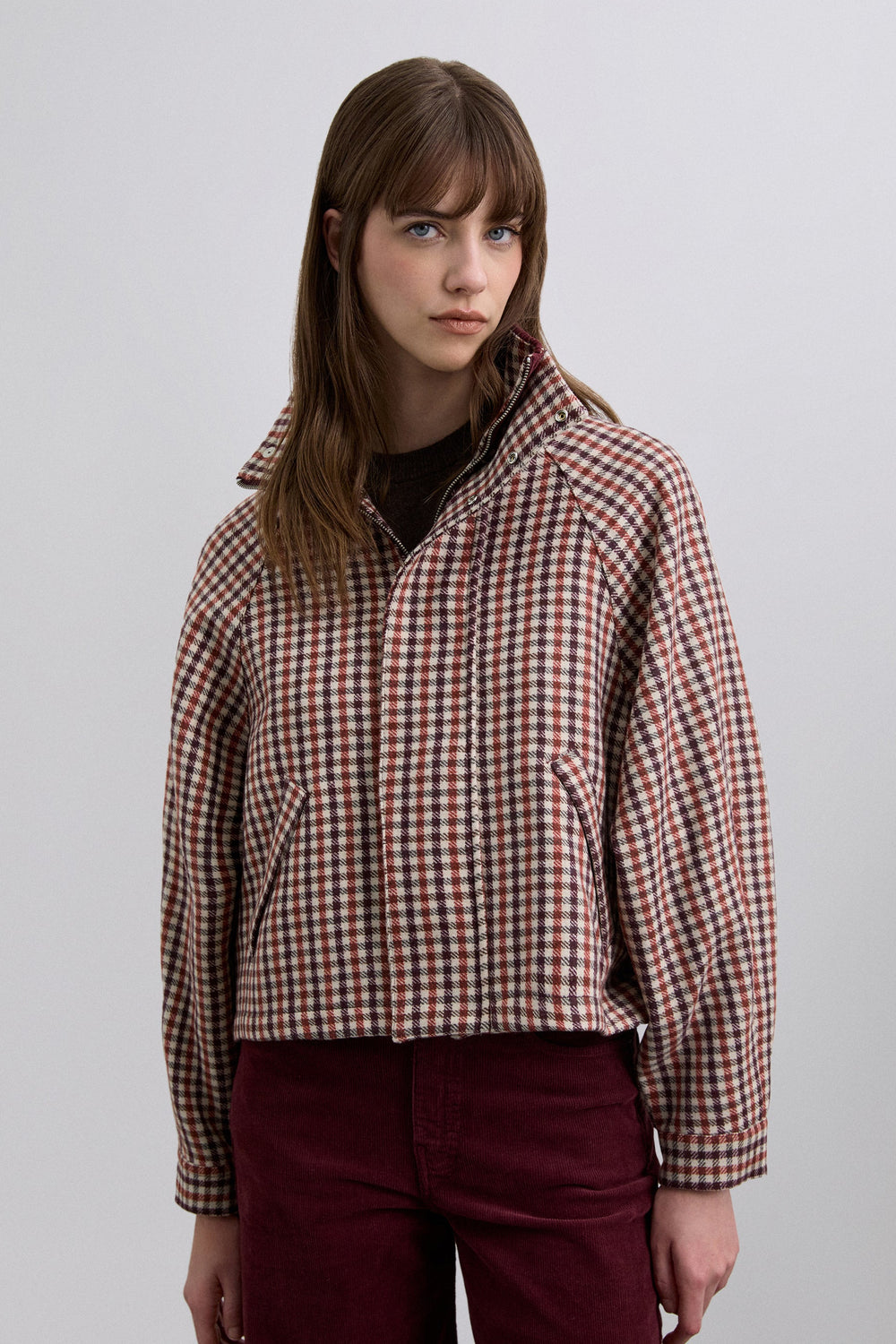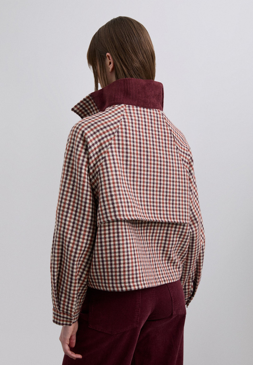 Bomber jacket made of a wool blend fabric in checked print. Slightly oversize, zip fastening and high collar with corduroy detail. Long raglan sleeves with buttoned cuffs and side pockets. Concealed zip fastening with placket and press studs.