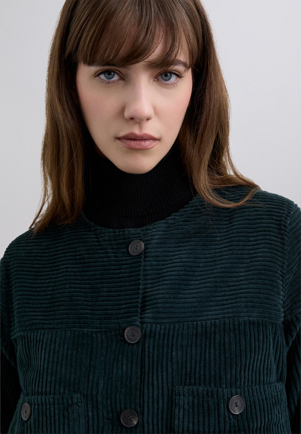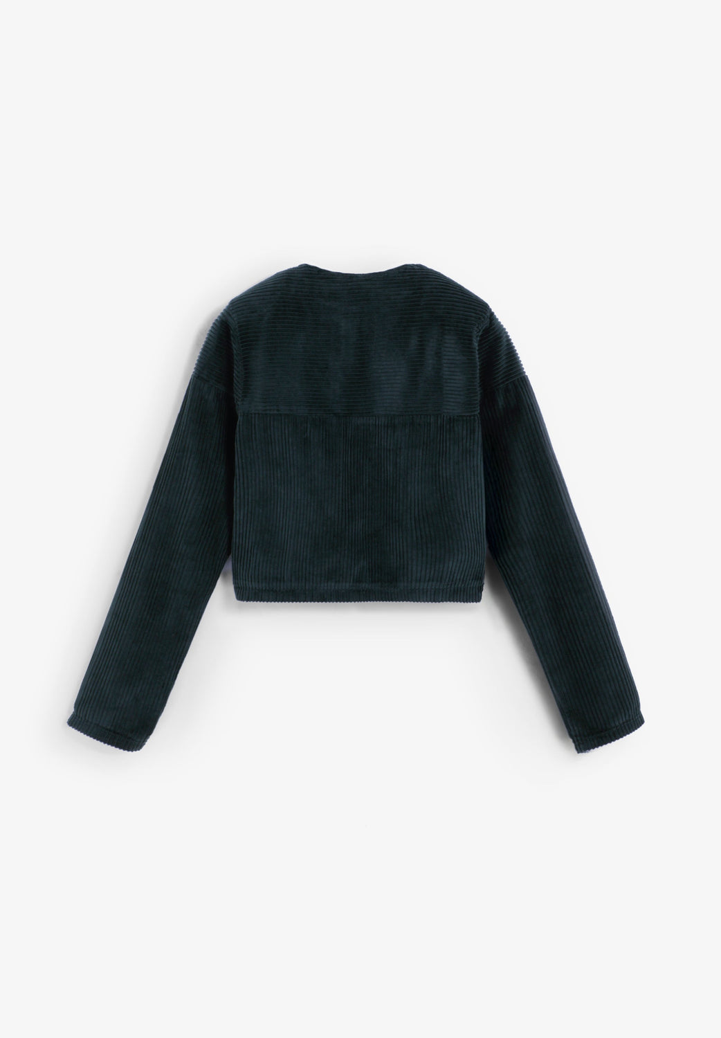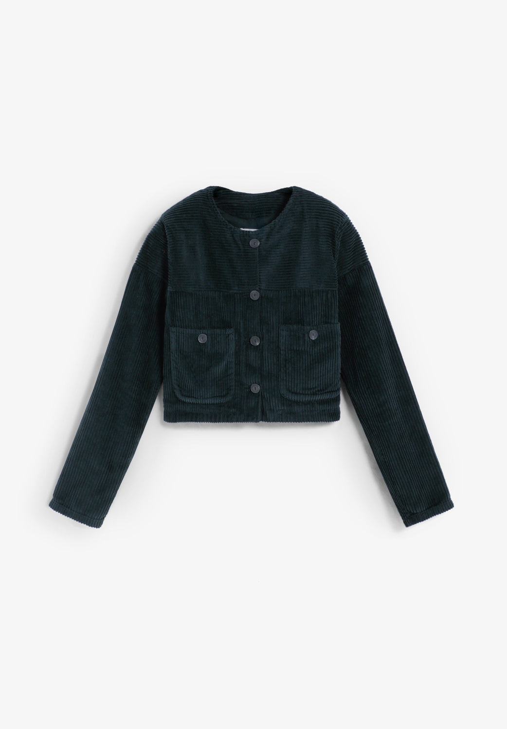 Collarless corduroy jacket in a boxy fit with buttons and front flap pockets.