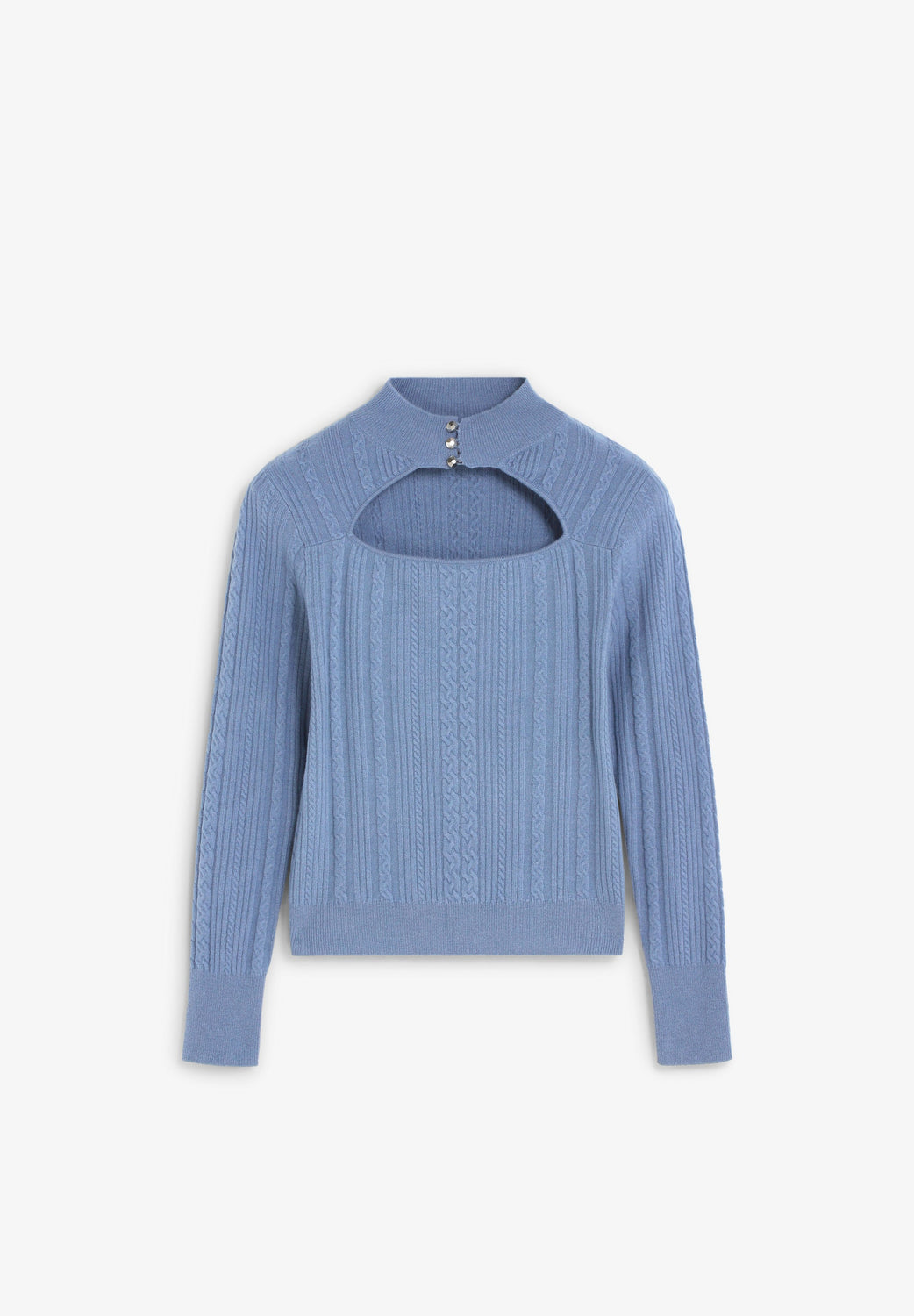 Cable knit sweater made of a wool and cashmere blend. Slim fit. High collar with button fastening. Cut-out at the neckline.
