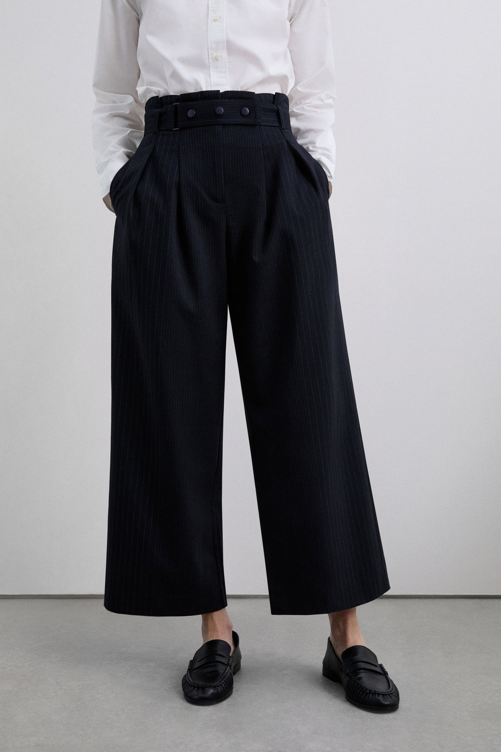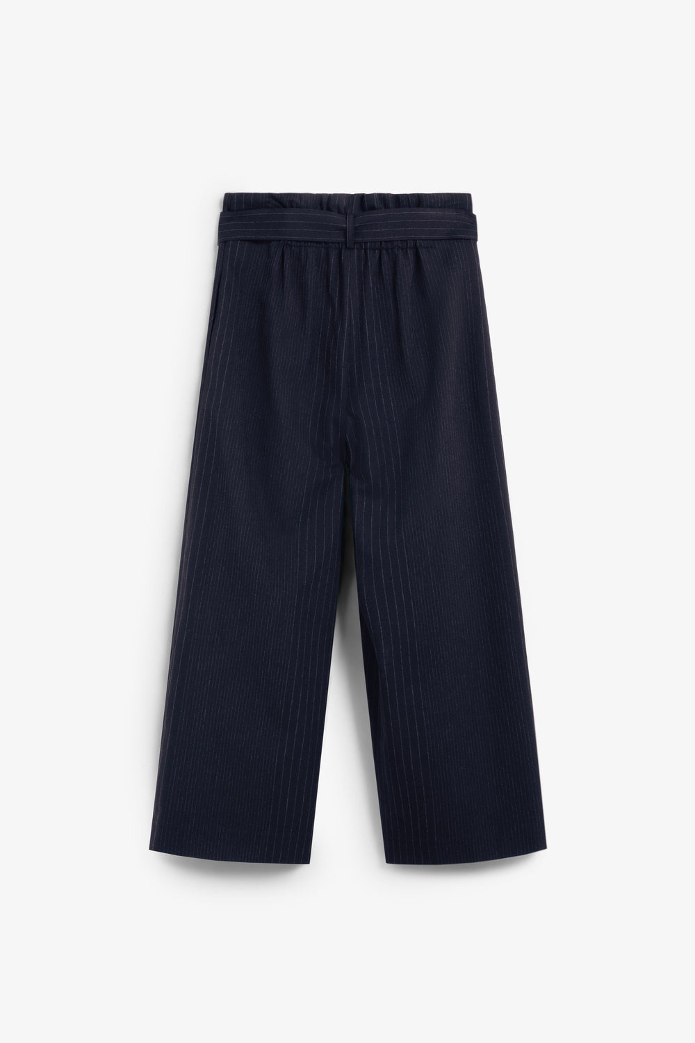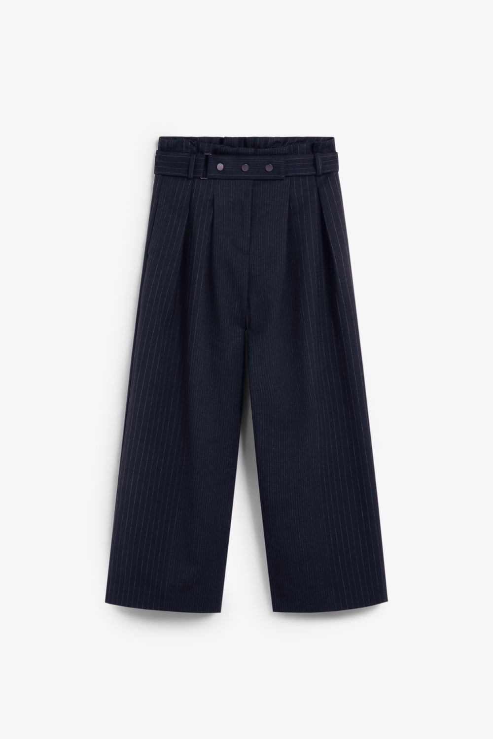 Pinstripe culottes made of 100% cotton. High cut. Belt loops at the waist. Zip fastening concealed by a flap, with hook and eye and button. Two side pockets.