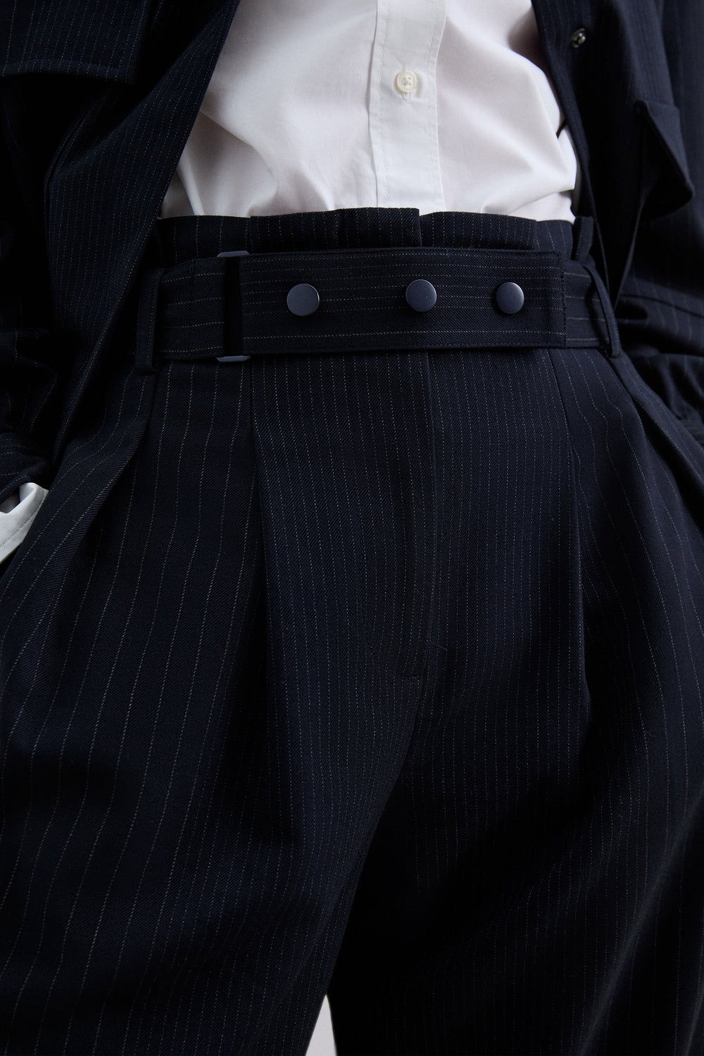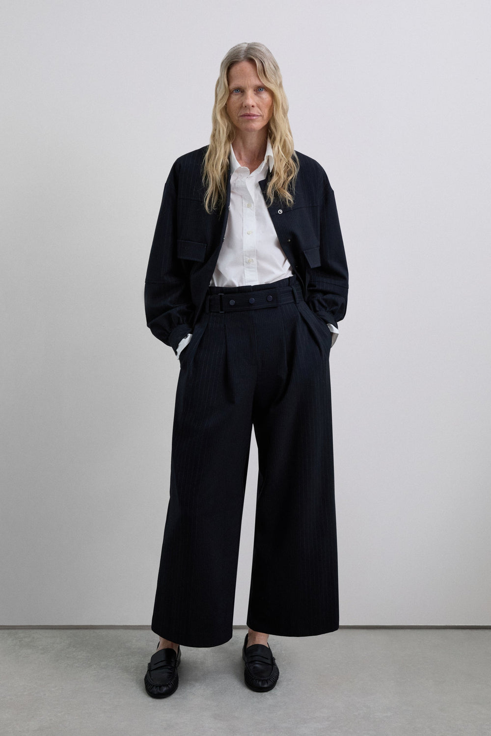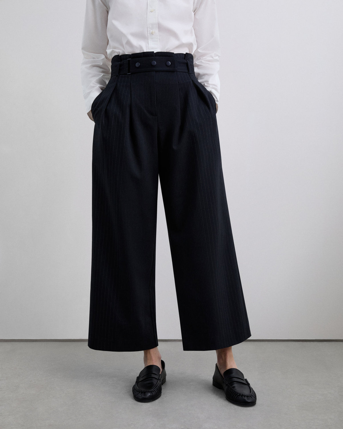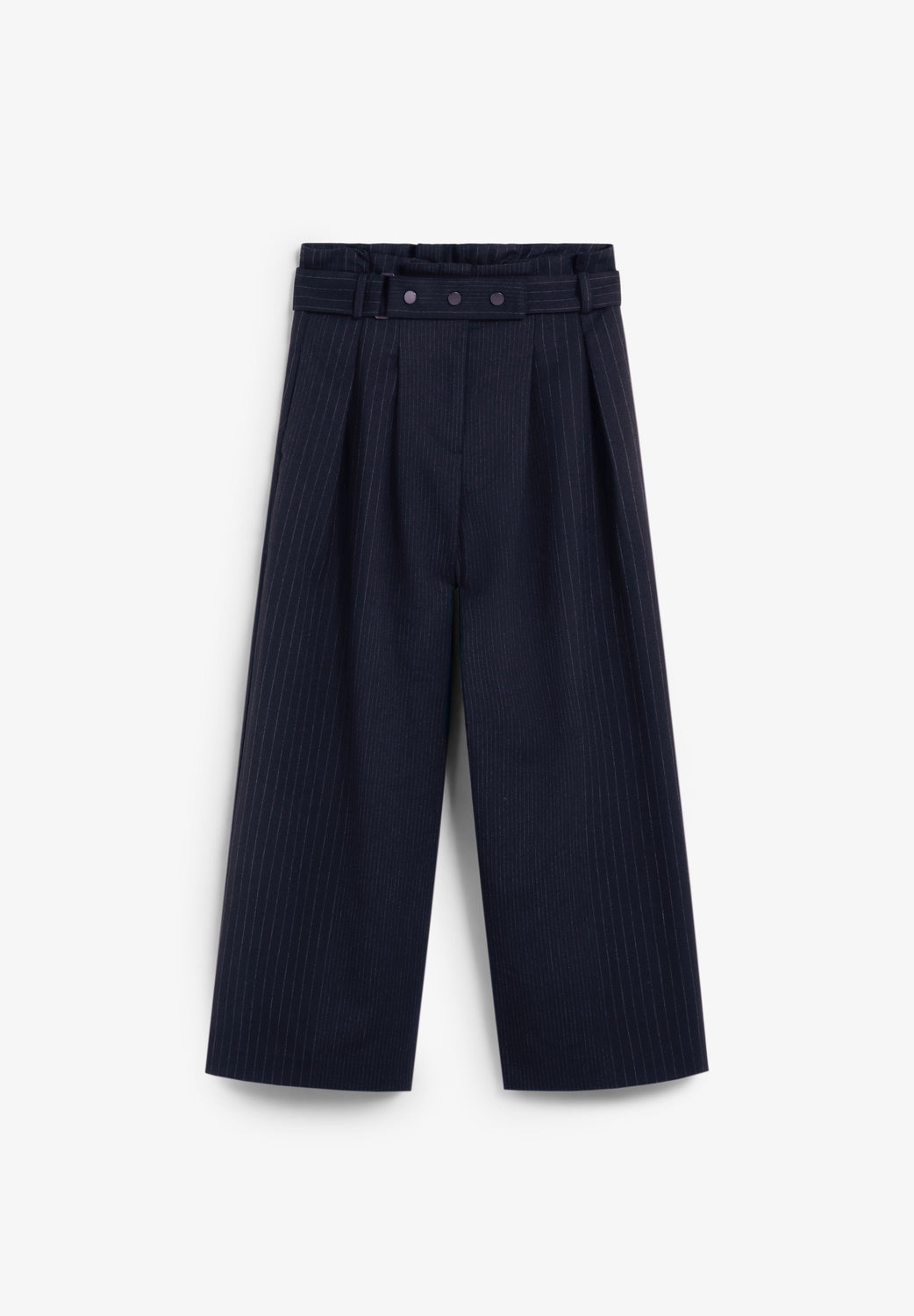Pinstripe culottes made of 100% cotton. High cut. Belt loops at the waist. Zip fastening concealed by a flap, with hook and eye and button. Two side pockets.