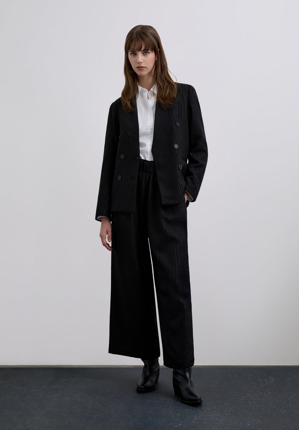 Pinstripe trousers with metallic detailing. Gathered waist. Regular fit.
