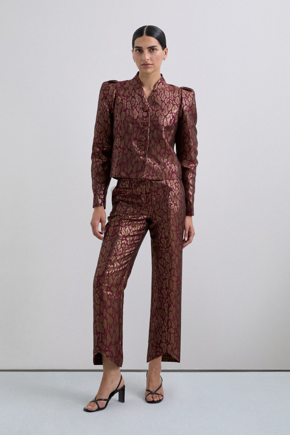 Trousers made of a metallic-effect fabric with animal print. Seams detail. Zip fastening. Asymmetric hems.