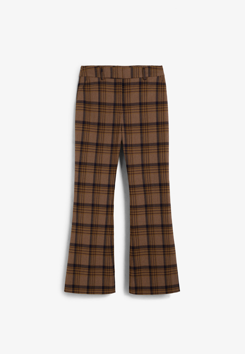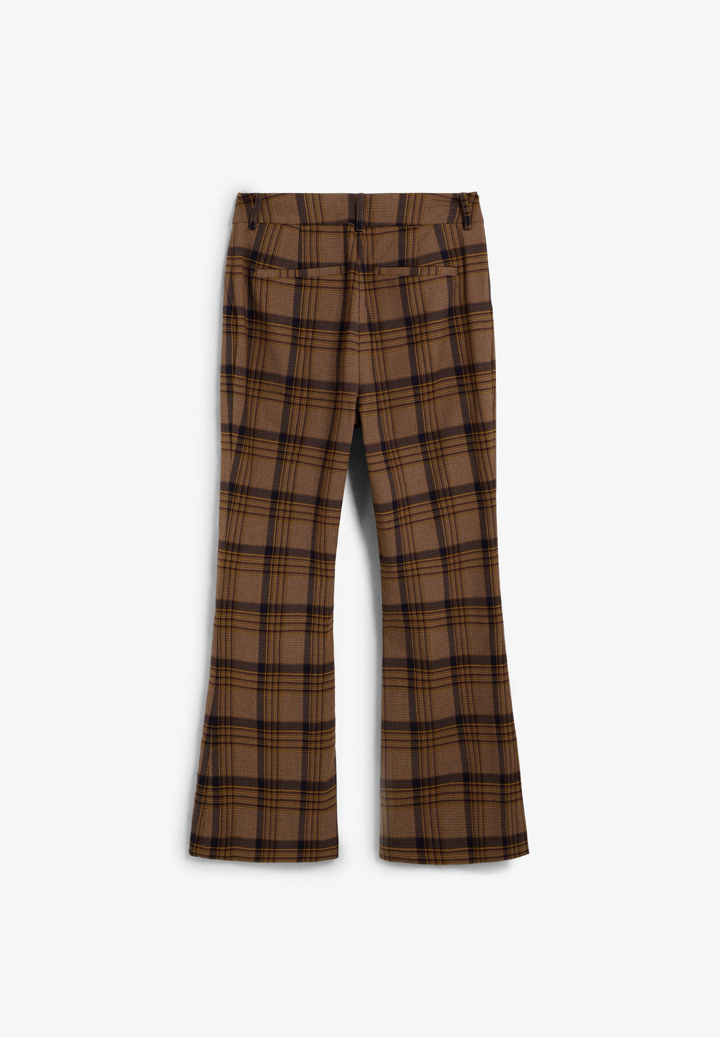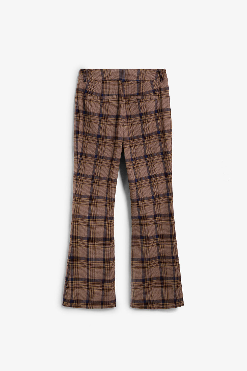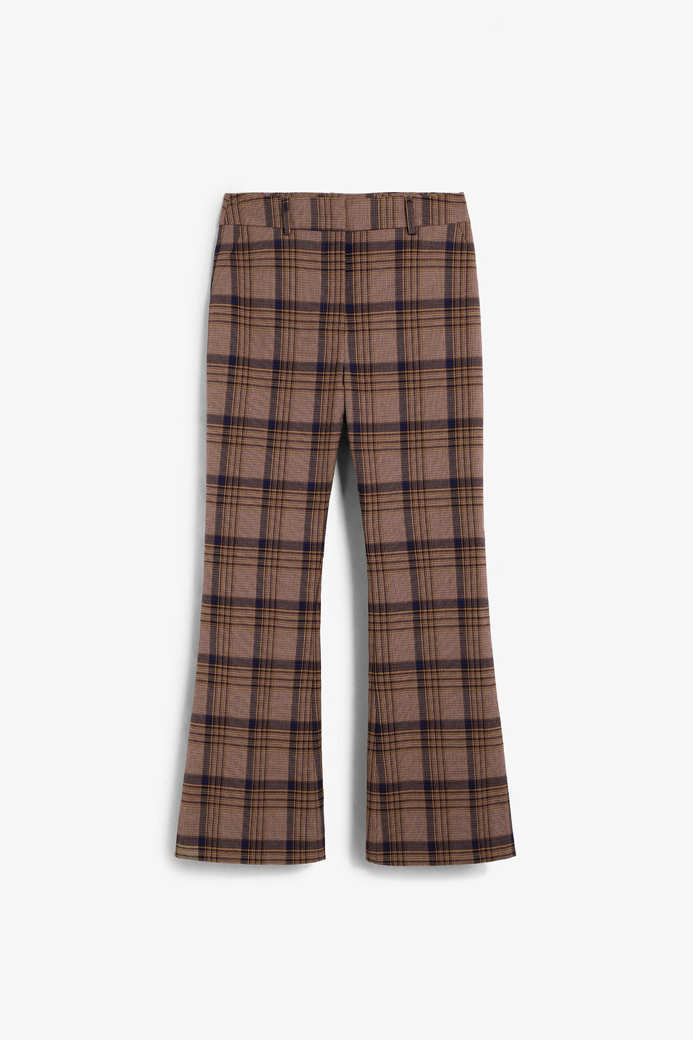 Ankle-length flare trousers. Check print. Two side pockets and at the back. Concealed zip and hook fastening. Belt loops at the waist.