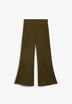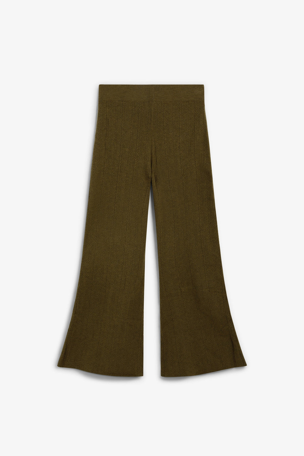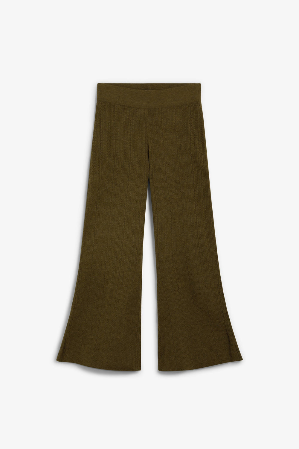 Trousers made of a cotton and wool blend. Fine cable knit texture. Flowing fabric with elastic waistband for snug fit. Long bell-bottom trousers.