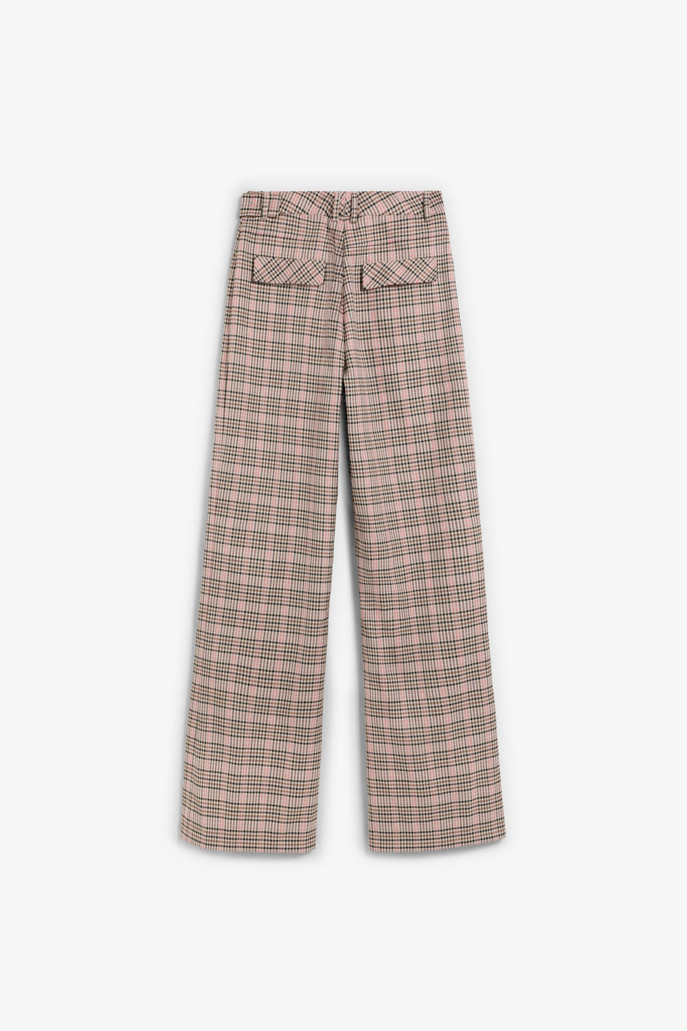 Flared trousers. Front pockets. Flap pocket at the back. Belt loops at the waist. Check print.