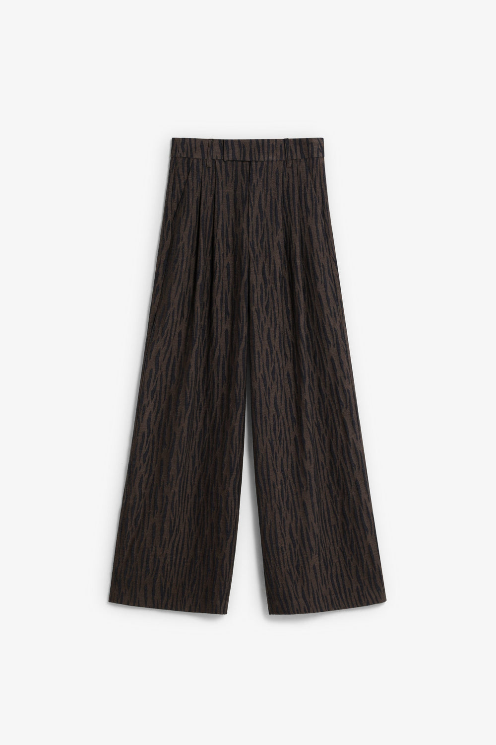 Trousers with zip fastening concealed by a placket, with hook and button. Two side pockets. Double dart detail on the front. Jacquard fabric with animal print.