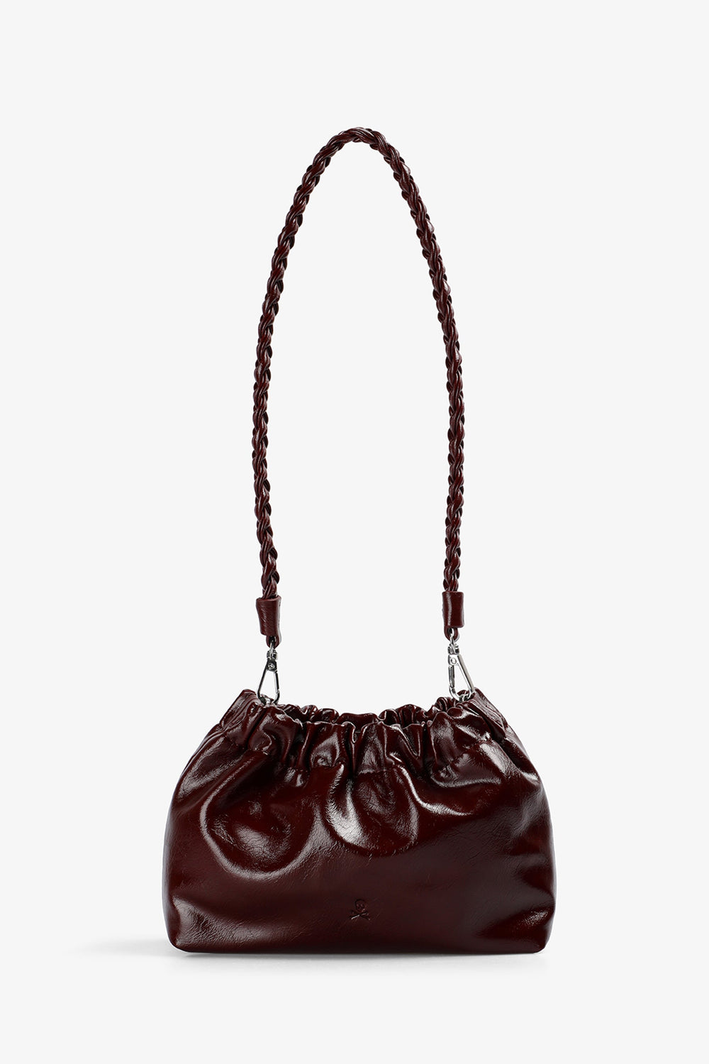 Handbag made of PU. Long detachable strap. Magnetic button fastening. Engraved logo detail on front.
