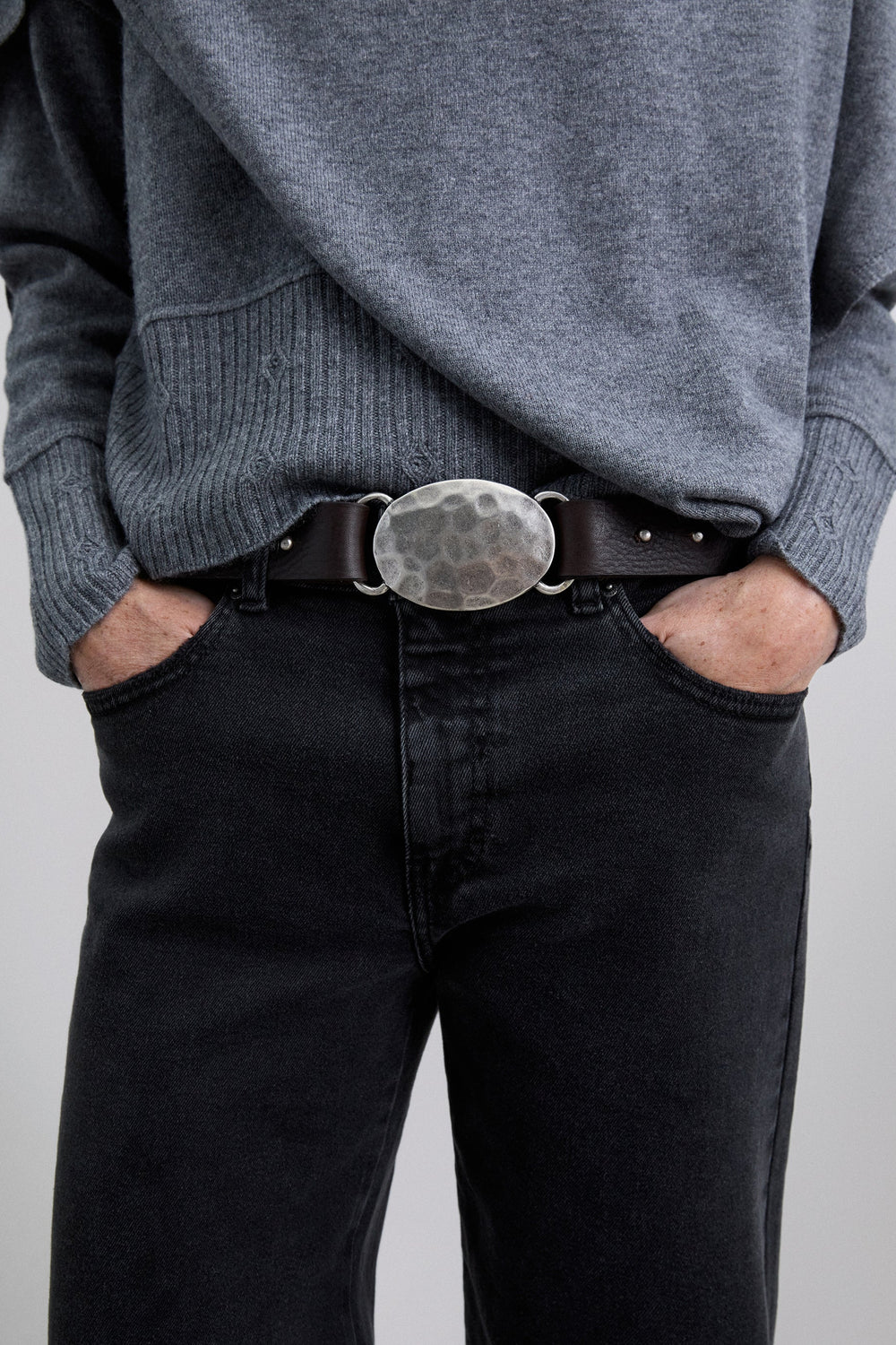 Belt made of 100% leather with an oval metal buckle with an irregular texture.