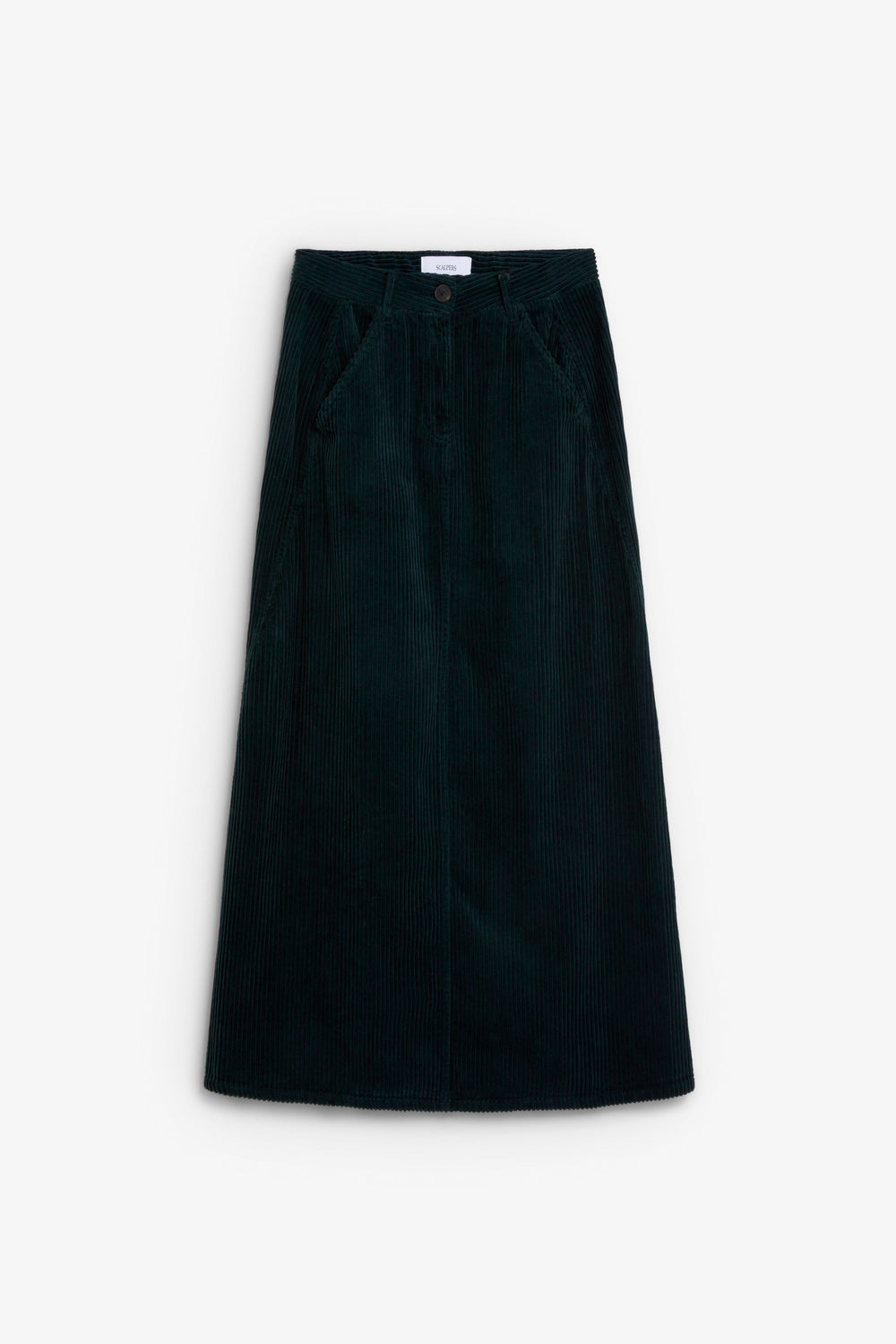 Corduroy skirt made of cotton. Pockets on the front. Zip and button fastening. Midi length. Belt loops.