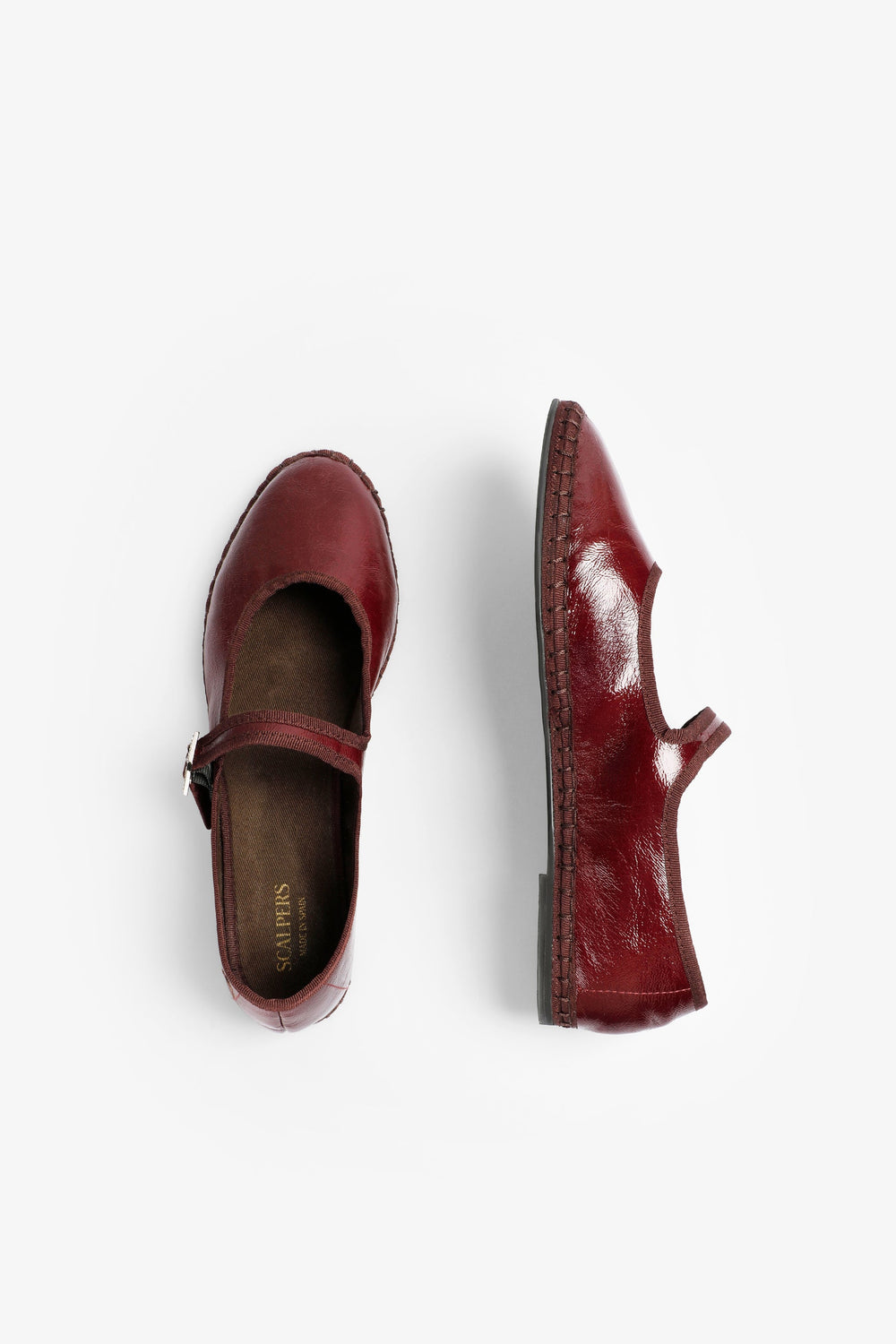 Ballet flats made of faux patent leather. Customised buckle fastening on strap. Tonal engraved logo detail.
