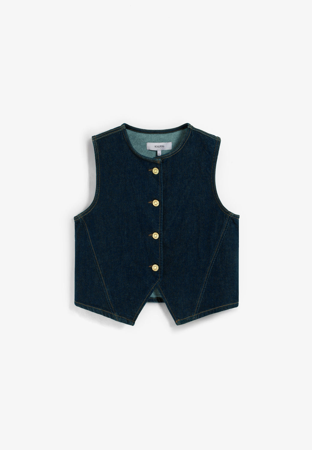 Denim gilet made of slightly stretchy BCI cotton. Cropped, sleeveless design, slim fit with round neck. Button fastening and front and back cut-out detail.