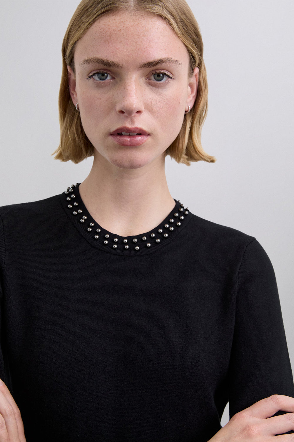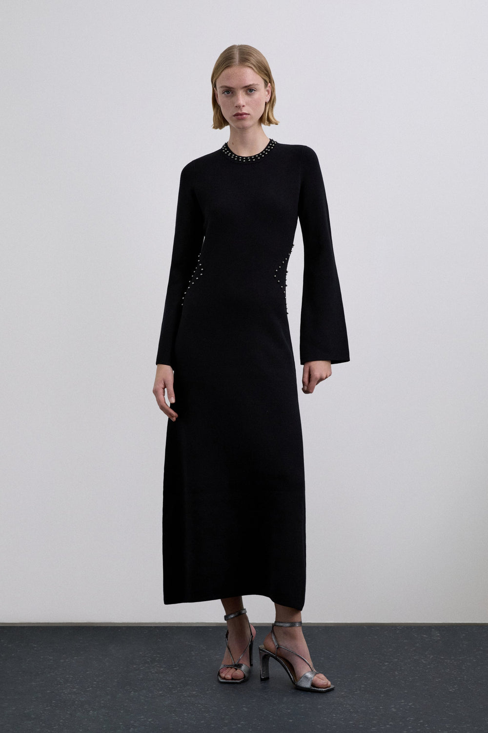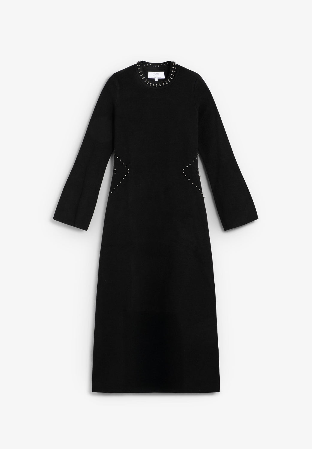 Knitted dress made of a viscoe blend. Slim fit. Round neck. Long flared sleeves. Stud detailing on ncollar eck and waist. Back vent.