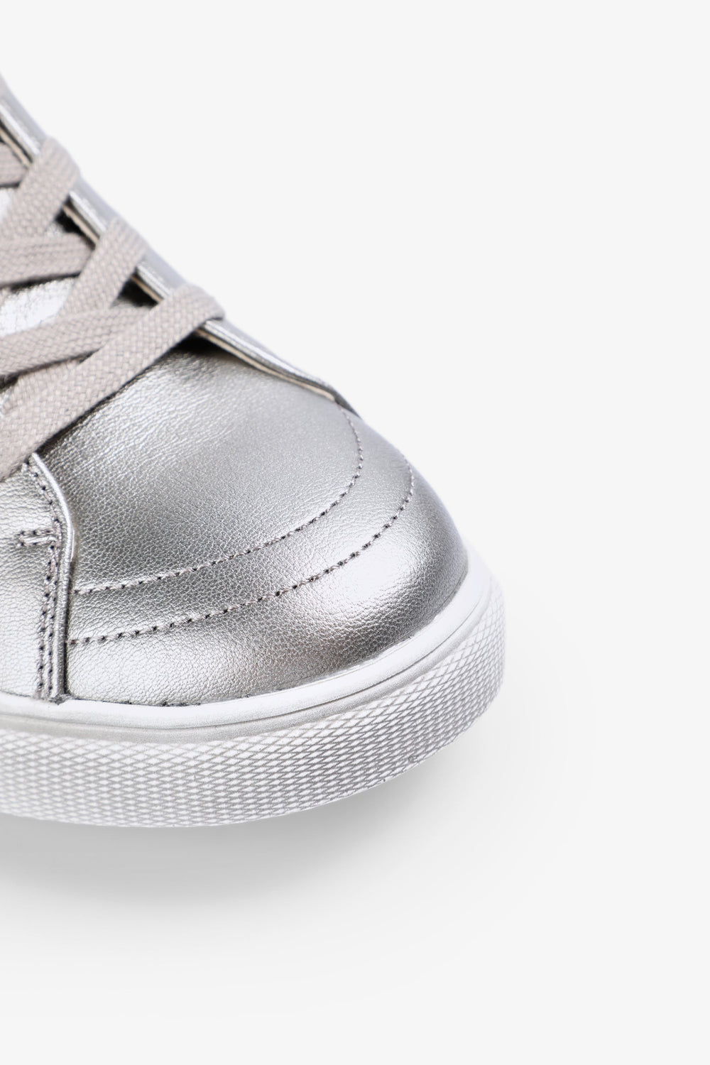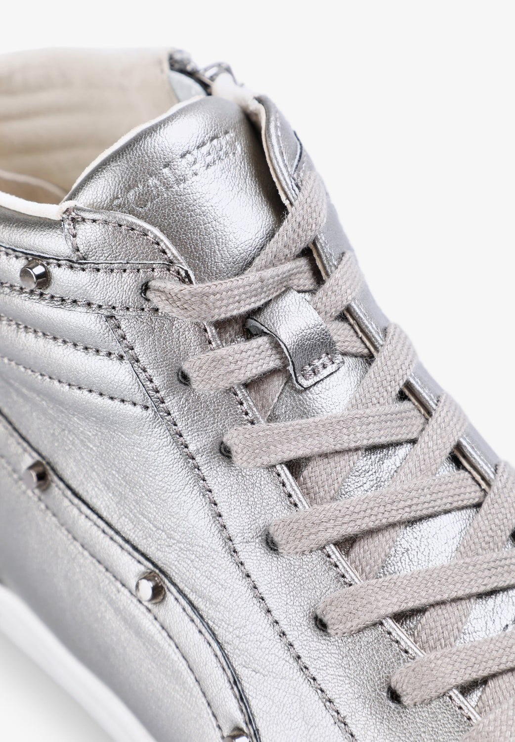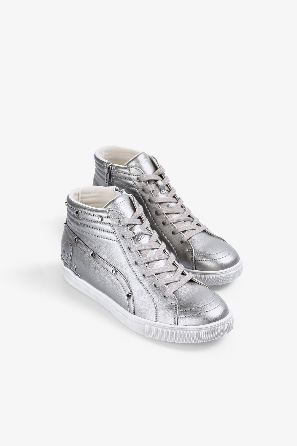 High top metallic sneakers made of 100% leather. Matching embroidered skull on side. Matching lace-up fastening and side zip. Tonal stitching detail with studs. Contrast rubber sole. Matching embroidered logo detail on the tongue.