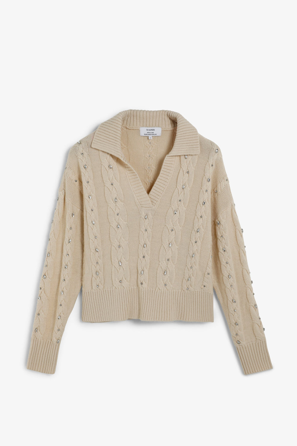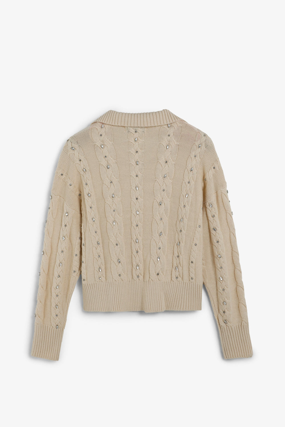 CABLE KNIT POLO SWEATER WITH RHINESTONES