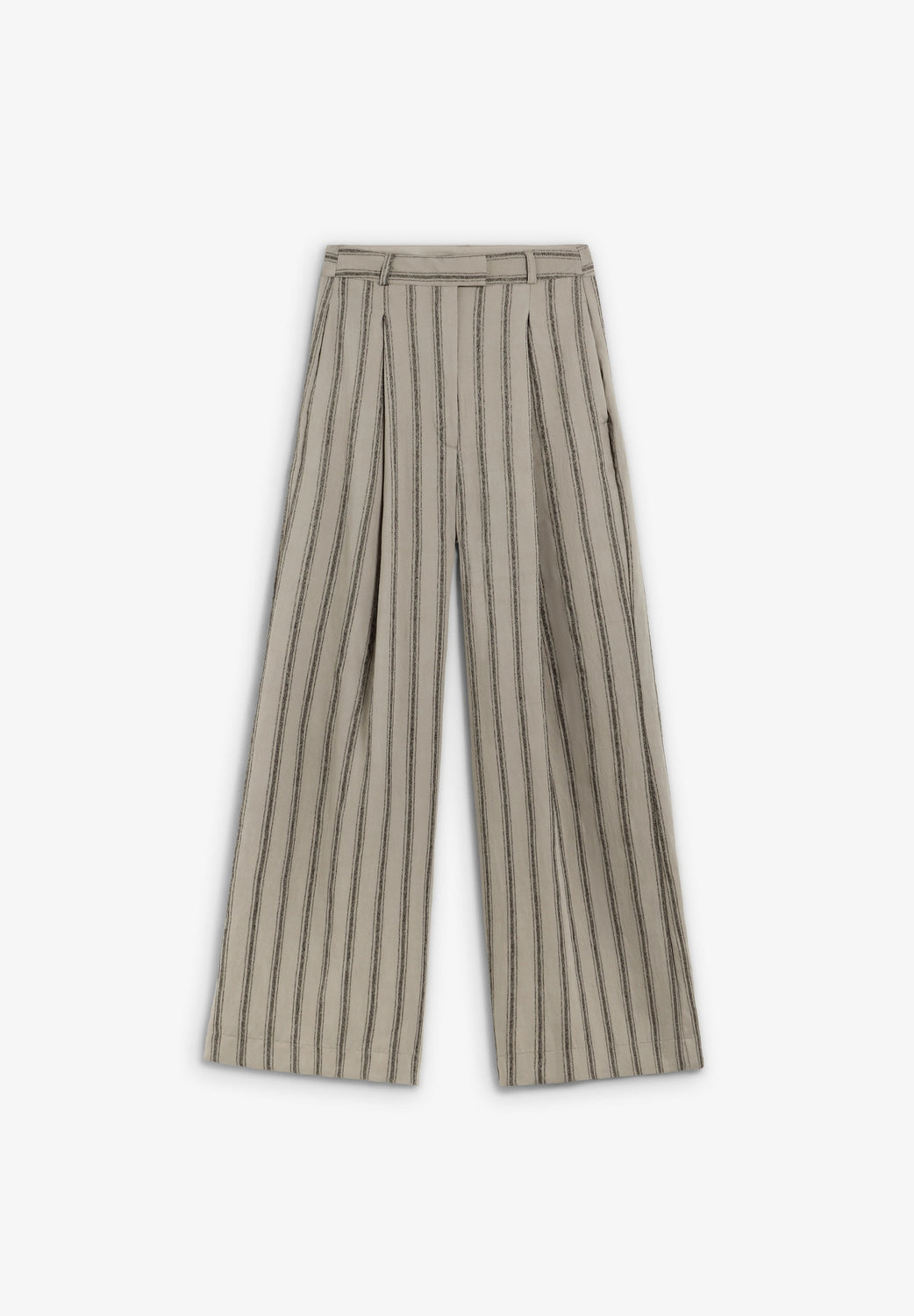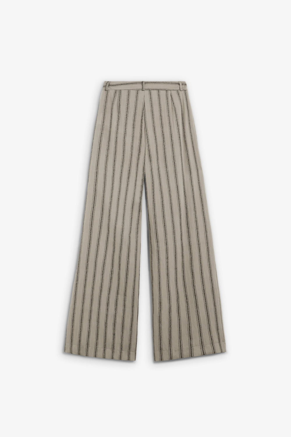 Pinstripe print trousers. Zip and top button fastening. Belt loops.