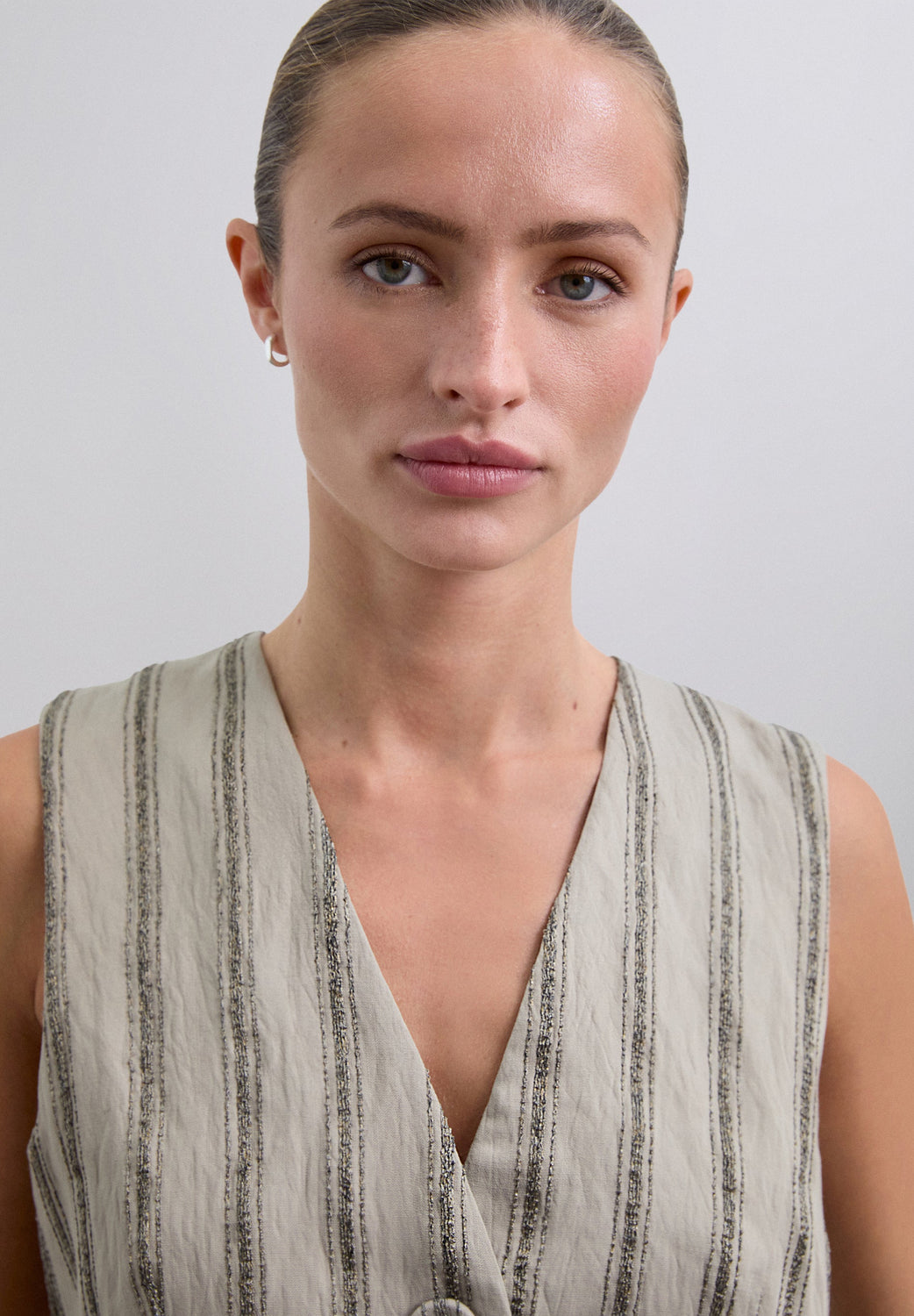 Striped waistcoat with metallic thread details. Made of flowing fabric. Regular fit. Button fastening. V-neck. Sleeveless design.
