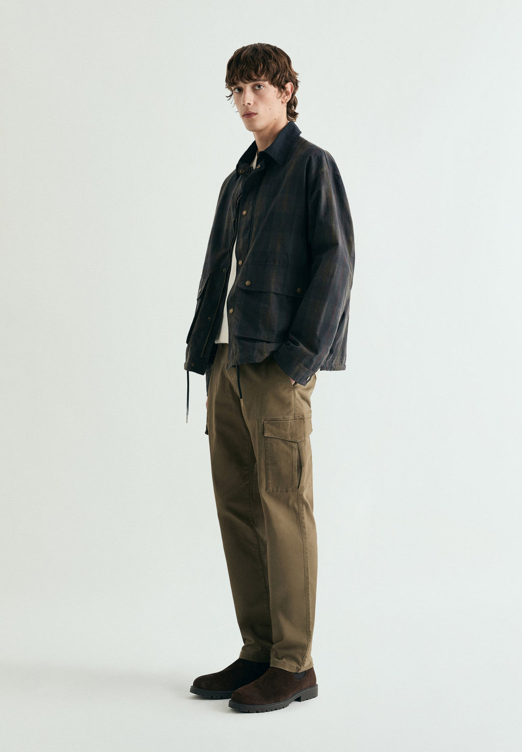 Cargo trousers made of cotton. Slim fit. Two side pockets with flap and reinforced placket. Welt pocket at the back. Front button and zip fastening.