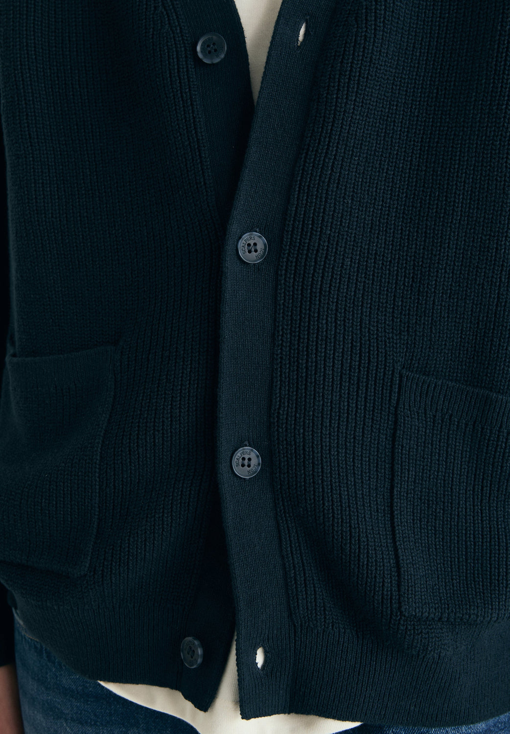 Cardigan made of a cotton and linen blend. Raglan sleeves. Polo shirt collar. Patch pockets. Front button fastening.