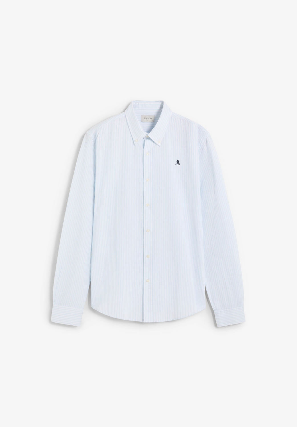 Oxford shirt made of a cotton and linen blend. Stripe print. Front button fastening. Contrast embroidered skull on the chest.