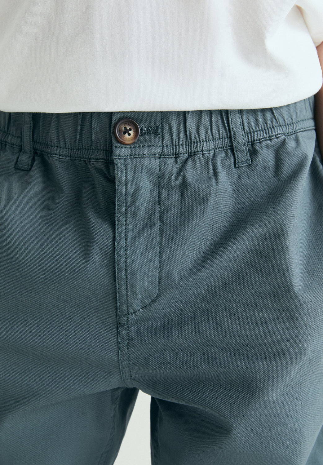 Trousers made of slightly stretchy BCI cotton. Relaxed fit Slightly elasticated belt loops. Side pockets. Button fastening.