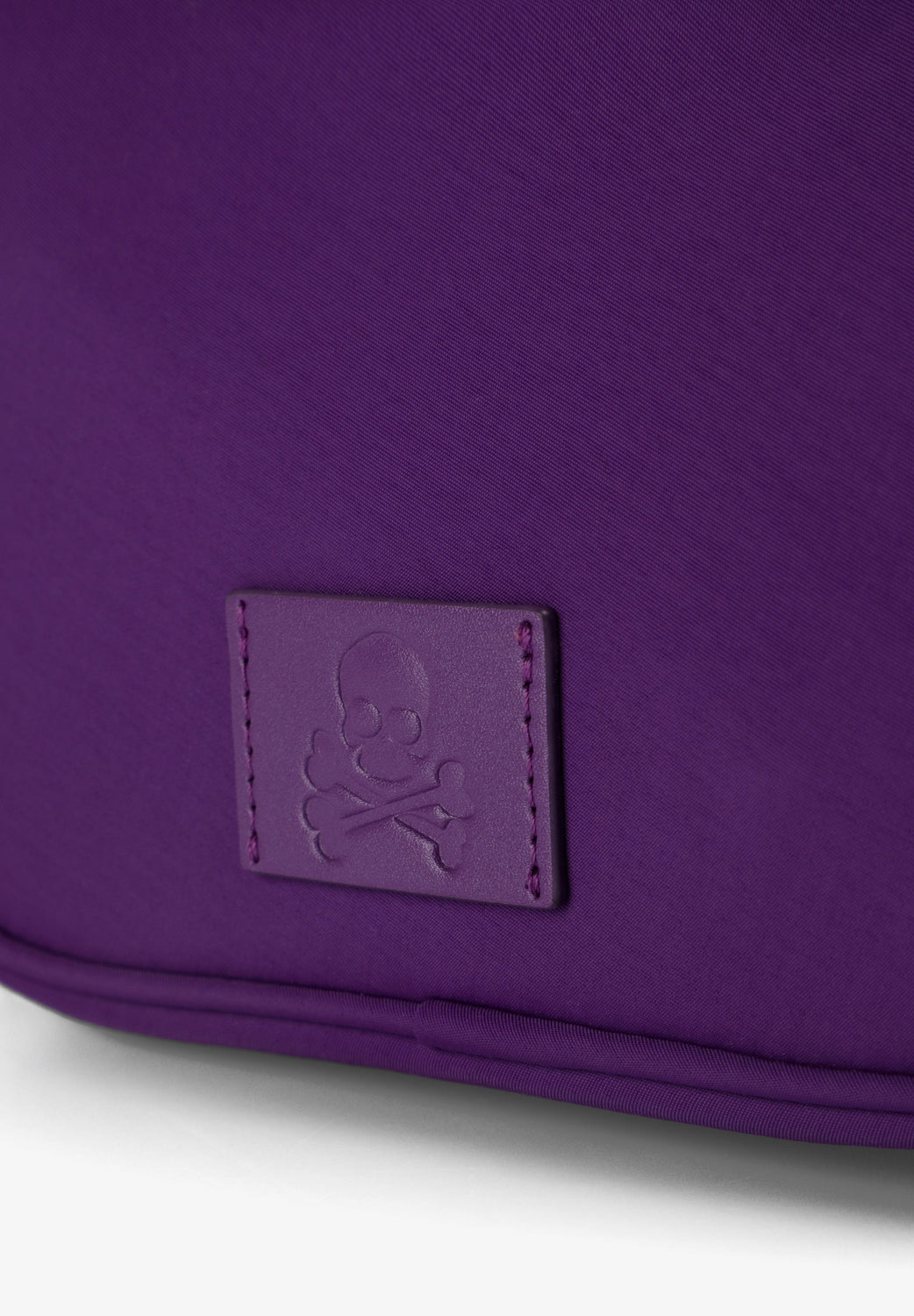 Mini crossbody bag in purple with adjustable strap. Zip closure and multicolour pull tab. Matching embroidered skull logo patch detail. Compact design.