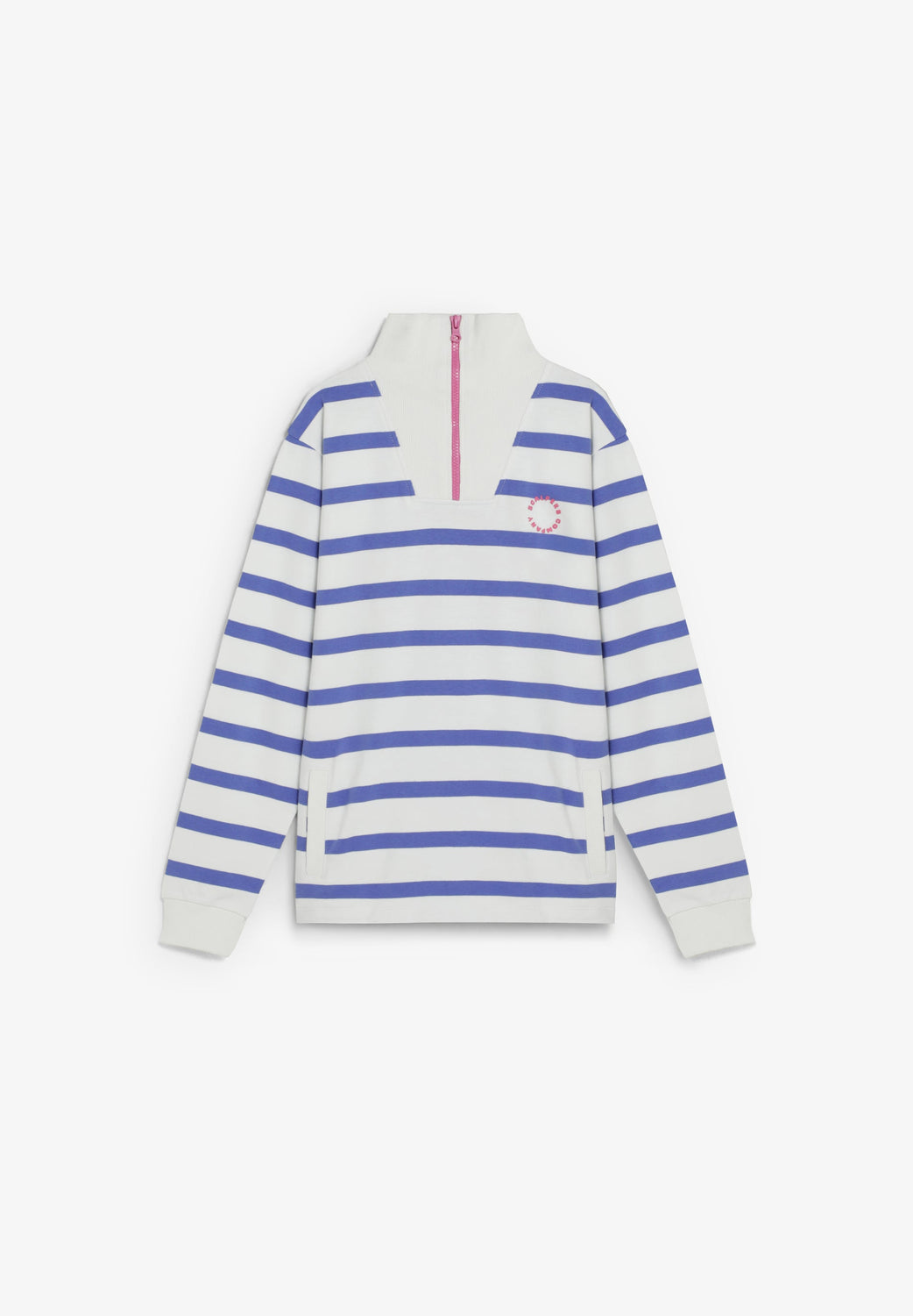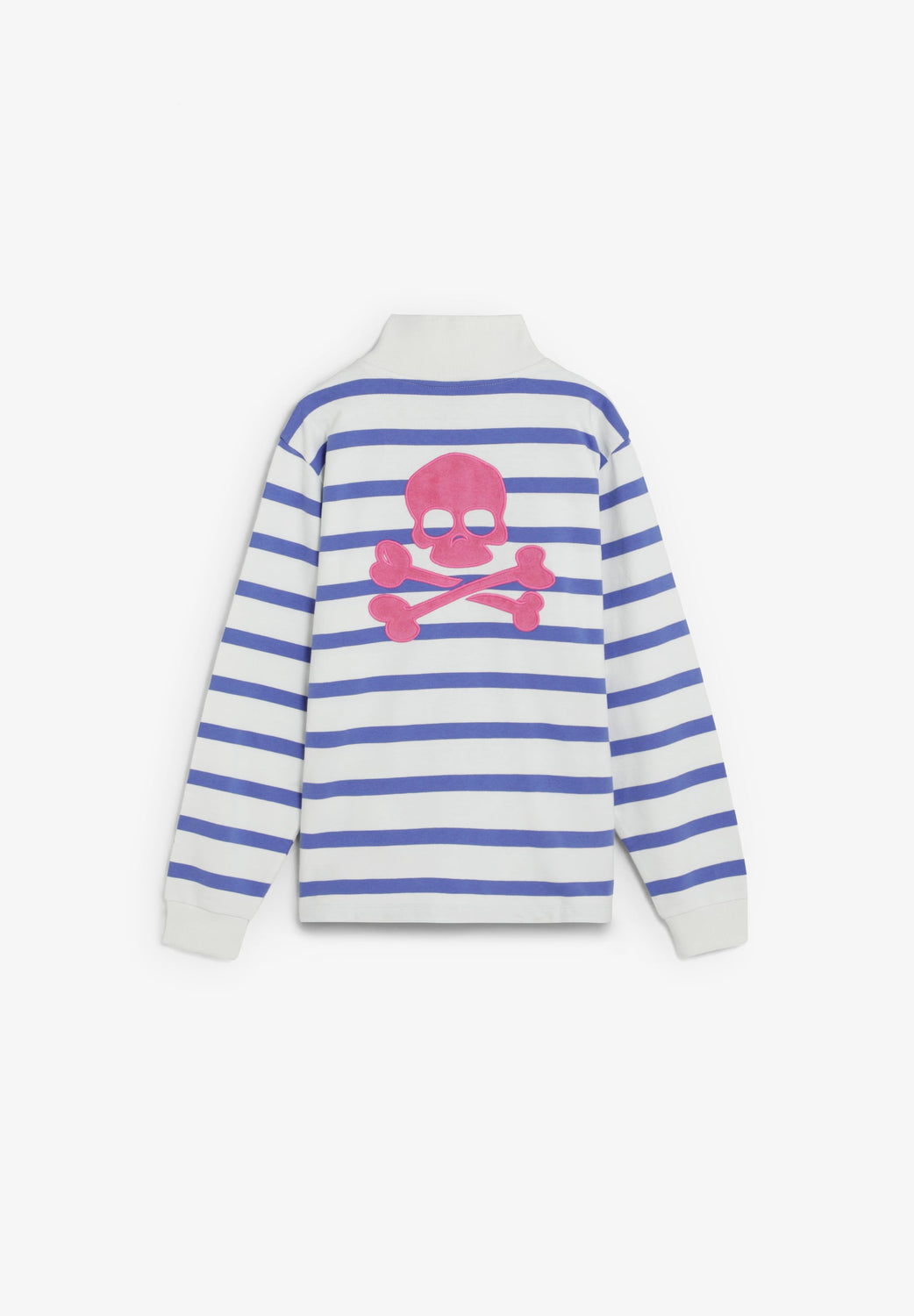 Sweatshirt made of 100% BCI cotton. Long sleeves. High neck with contrast zip. Front pouch pockets. Striped print. Embroidered skull on back. Logo detail on the chest Ribbed trim.