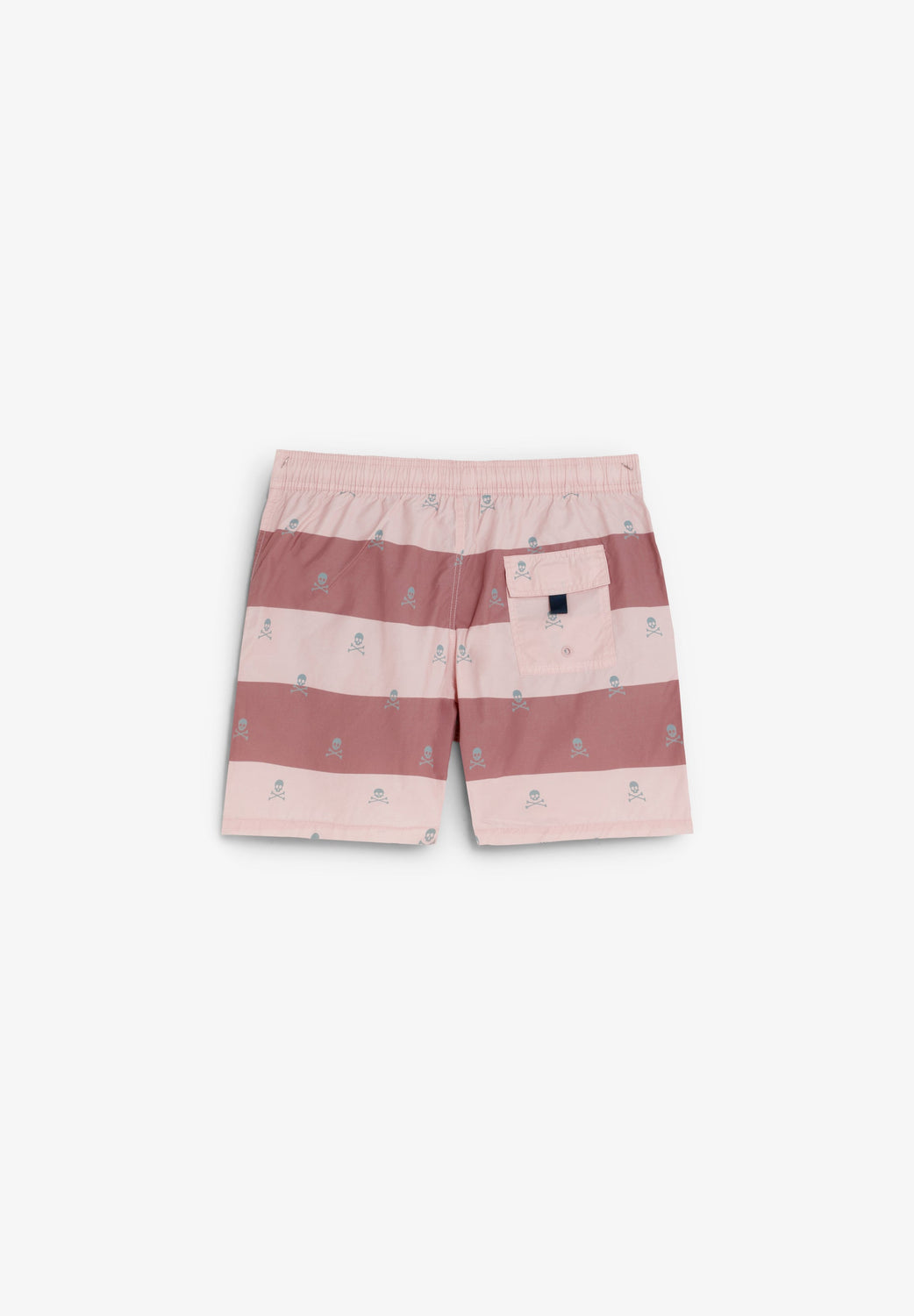 Swimming trunks with elasticated waistband and drawstring. Side pockets. Contrast stripes and skulls print. Back pocket.