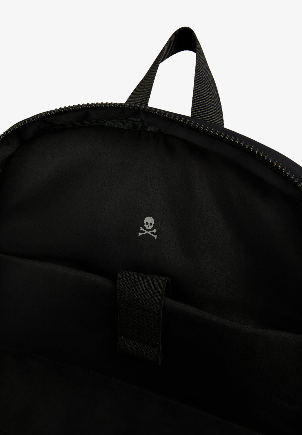 Double pocket backpack with rubberised patch on the front. Made of technical fabric Zip fastening. Top handle and back straps. Elastic details. Front zipped pocket.