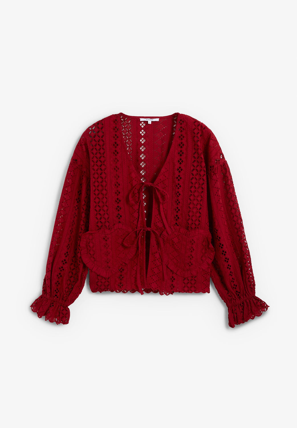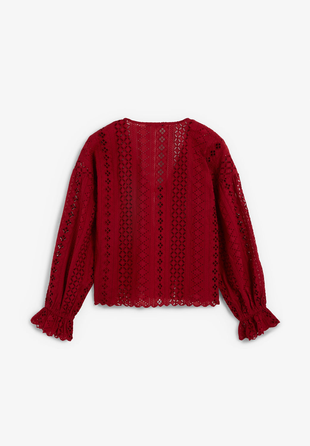 Blouse made of 100% cotton fabric. Hearts detail on front. Perforated fabric. Double tie-up front fastening. V-neck and long sleeves. Gathered ruffle on the cuff.