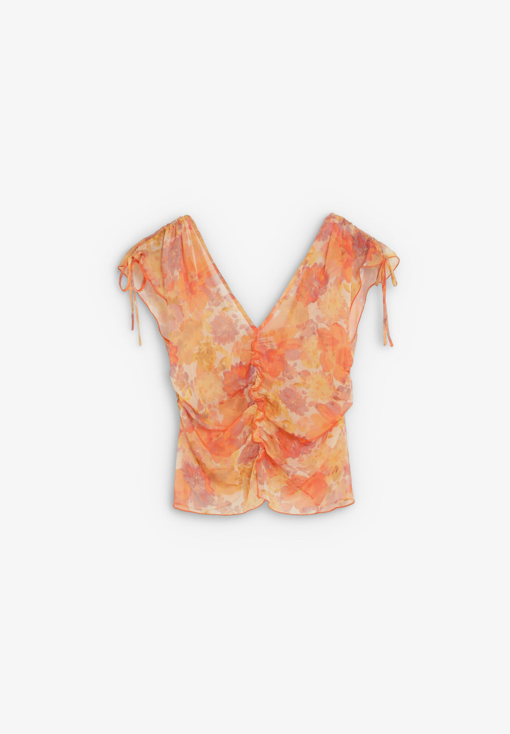 Blouse made of semi-sheer flowing fabric. Regular fit. V-neck and short sleeves with gathered details. Floral print.