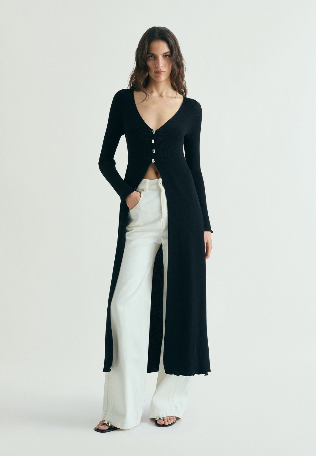 Long cardigan in a ribbed knit fabric. V-neck. Long sleeves. Front fastening.