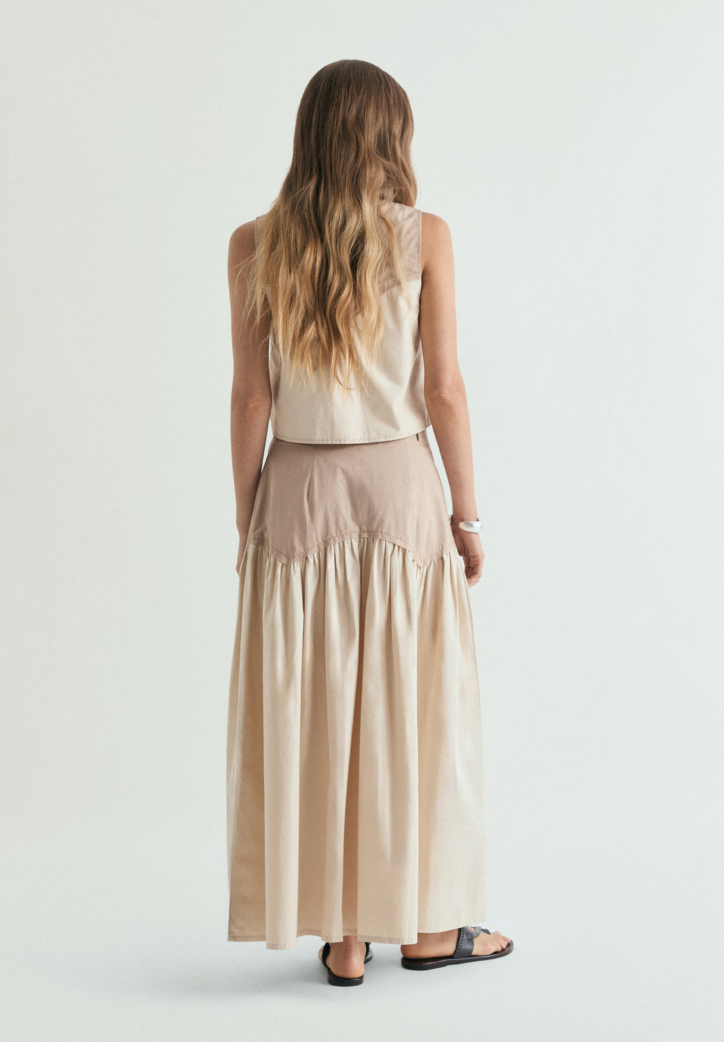 Midi skirt made in two contrast fabrics. Slim fit. Belt loops at the waist and zip and button fastening. Peaked detail at fabric joins. Concealed side pockets.