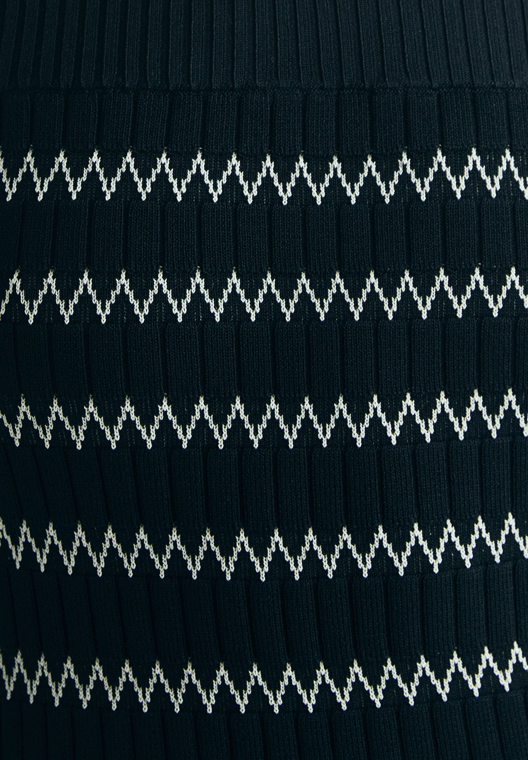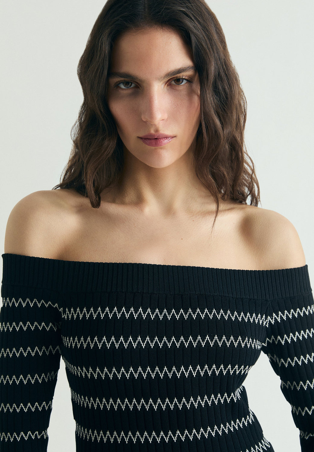 Knitted dress with a textured stripe design. Bardot neckline. Fitted sleeves and silhouette with ruffles.