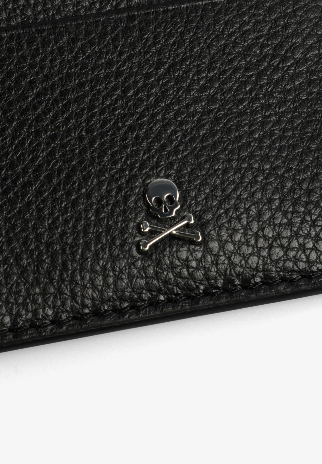 Card holder made of leather with metal skull detail.
