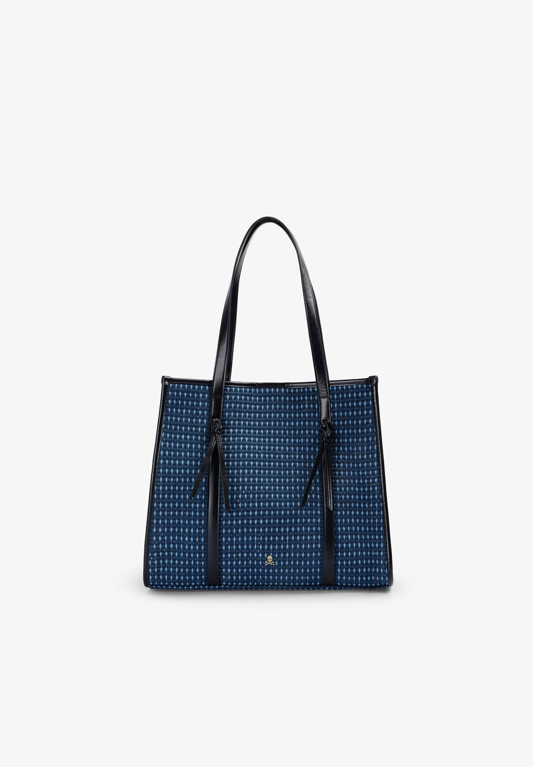 Tote bag made of braided fabric. Double handle with decorative straps. Lined with zipped pocket. Magnetised button fastening.