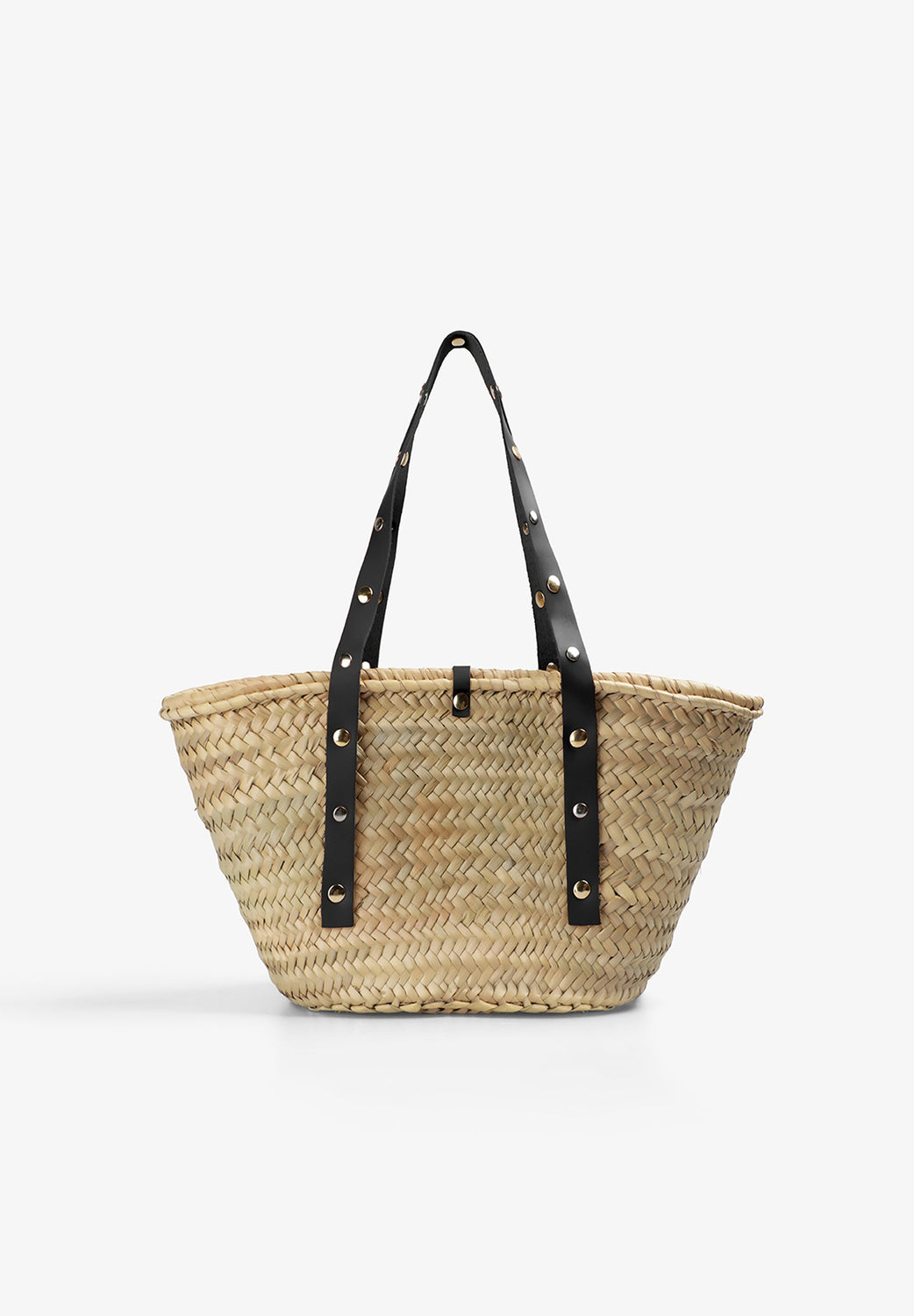 Natural fibre carrycot bag. Double shoulder strap with stud detail. Small leather handbag with a clasp. Inner closure. Engraved detail on inner bag and metallic skull on the side.