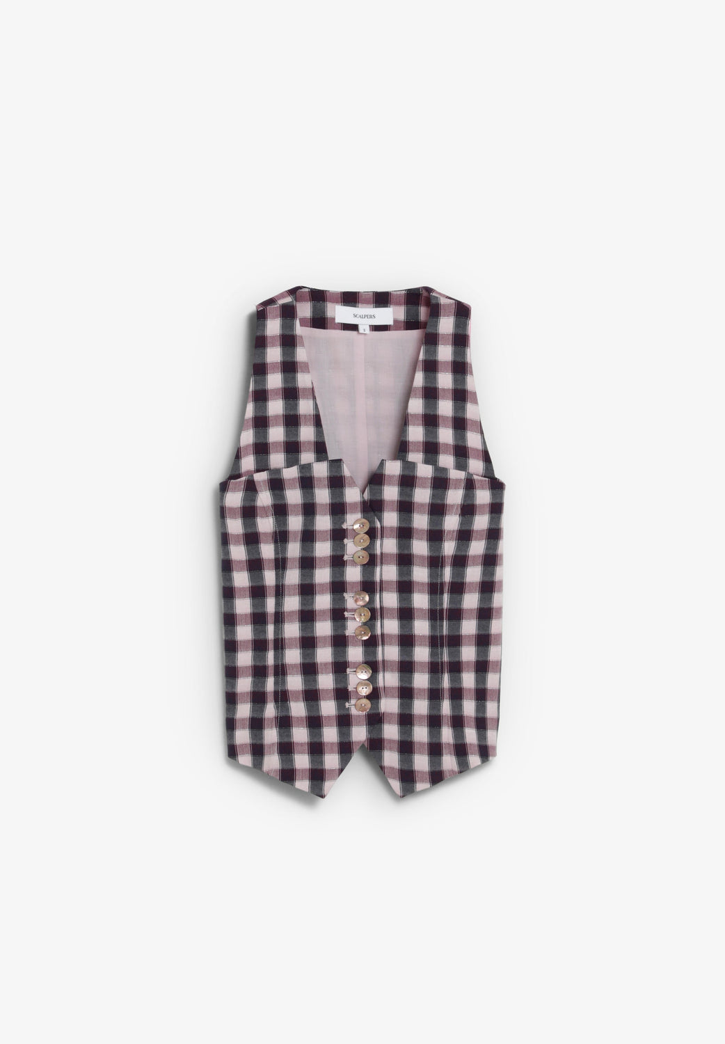 Waistcoat made of flowing fabric with metallic thread. Slim fit. Gingham print. V-neck and wide straps. Front button fastening.