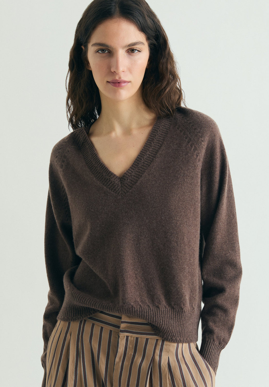 Trousers made of a flowing fabric with a striped print. Regular fit with darts at the waist. Zip and hook fastening. Front slant pockets.