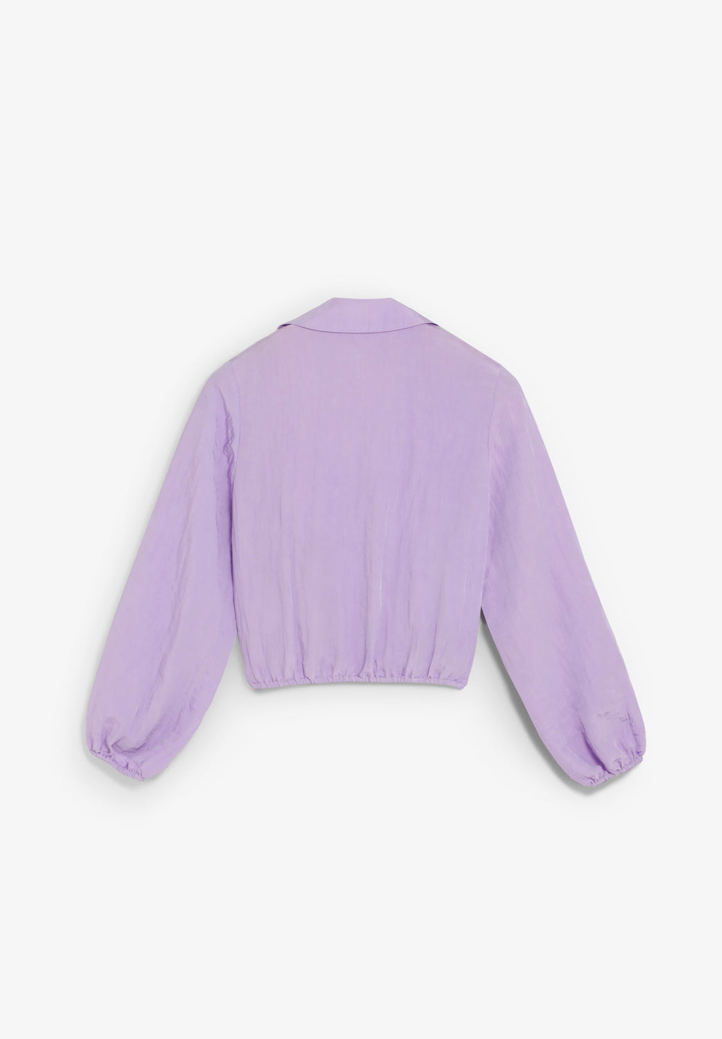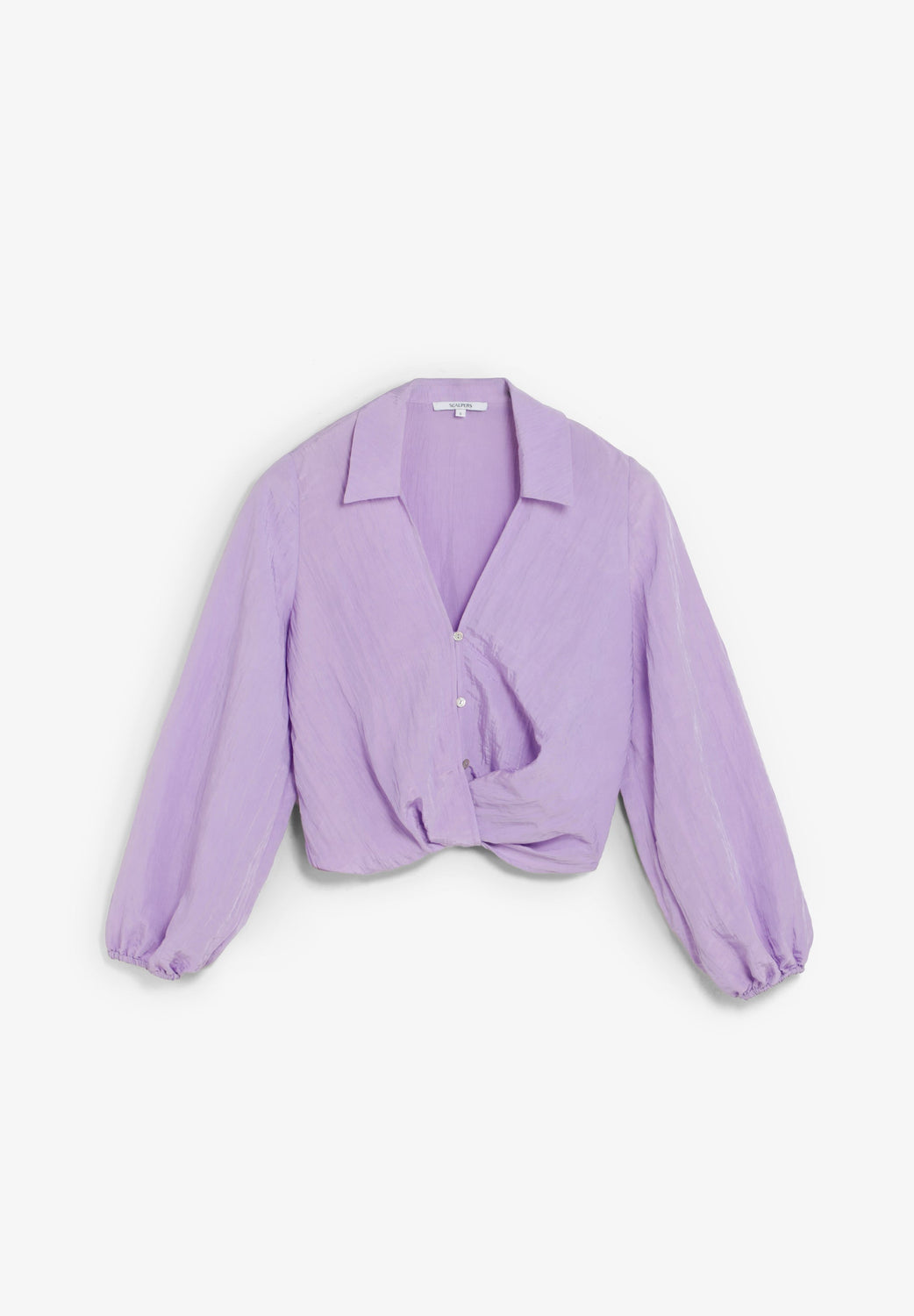 Blouse made of flowing fabric. Shirt collar with V-neckline and long sleeves with elasticated cuffs. Criss-cross detail on the hem. Front button fastening.